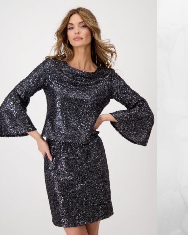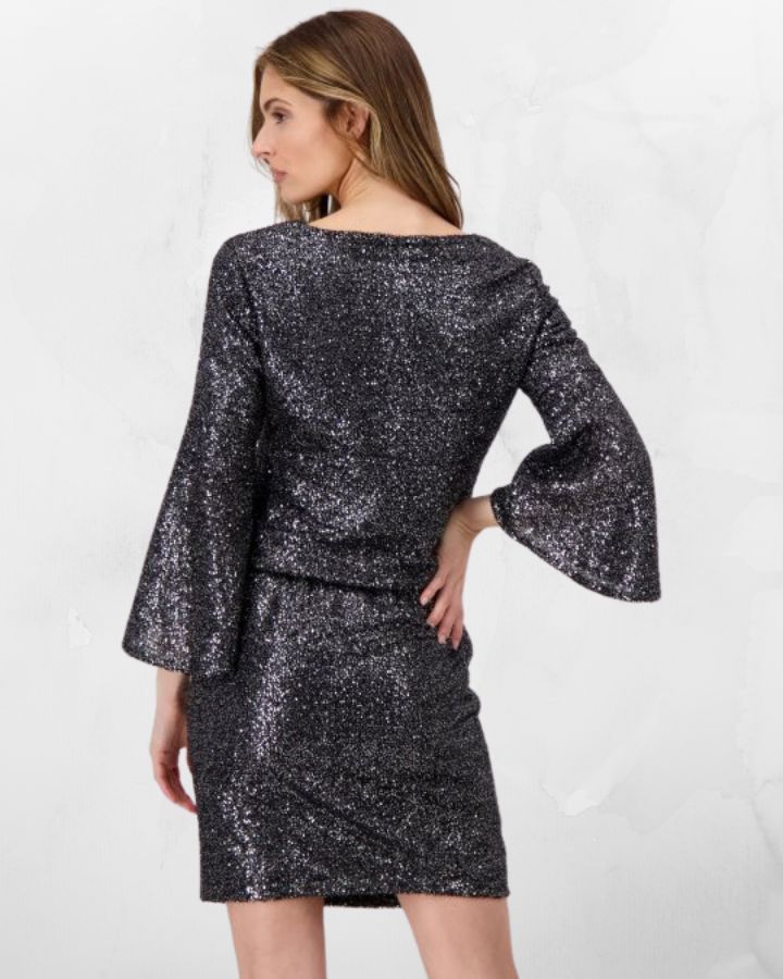 Top à paillettes avec manches larges et fermeture éclair sur le côté gauche.