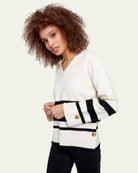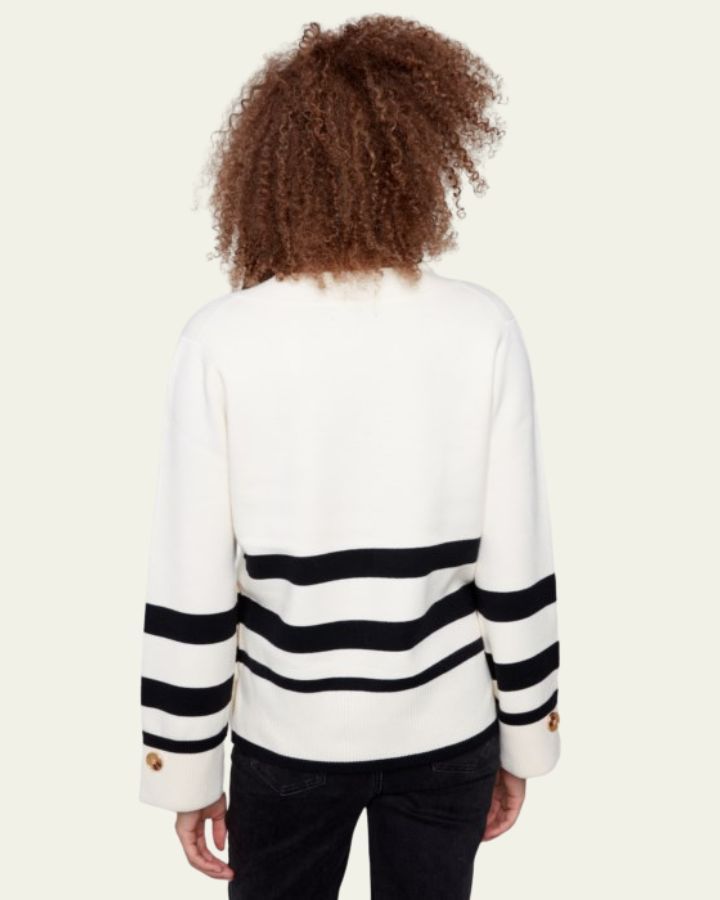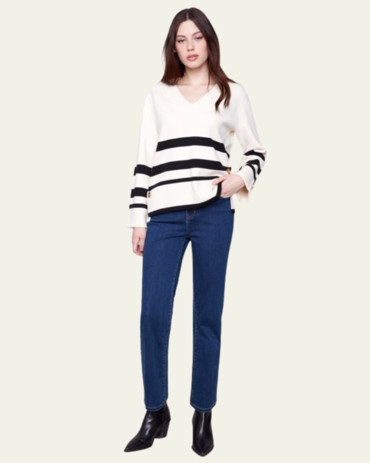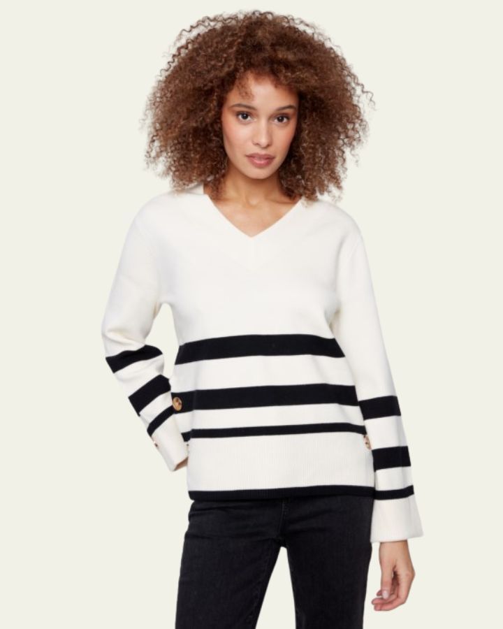 Ce pull présente un design minimaliste rehaussé de rayures horizontales noires sur fond blanc, pour une allure graphique et moderne. Le col en V apporte une note féminine et structurée, idéale pour un look casual soigné. Des boutons décoratifs sur les manches longues ajoutent une touche originale et élégante. Sa maille douce et confortable en fait une pièce parfaite pour la mi-saison. Facile à associer avec un pantalon noir ou un jean, il se prête aussi bien aux journées détendues qu’aux sorties entre amies.