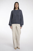 Ce chandail à manches ballon séduit par sa maille épaisse légèrement brillante, qui capte la lumière et révèle des nuances discrètes de couleur. Sa coupe ample et sa texture côtelée offrent un confort enveloppant, tout en ajoutant du caractère à la silhouette.