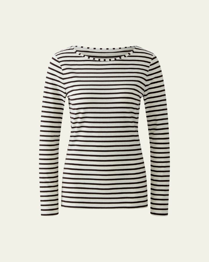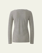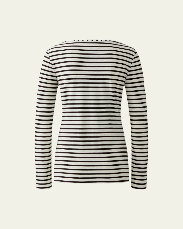 Ce t-shirt à manches longues revisite le style marin avec une rayure horizontale intemporelle. Confectionné dans un tissu doux et confortable, il présente une coupe droite et un col rond sobre, parfait pour un look casual chic. Polyvalent et indémodable, ce t-shirt se porte aussi bien rentré dans un pantalon taille haute que superposé sous une veste pour une tenue plus habillée.