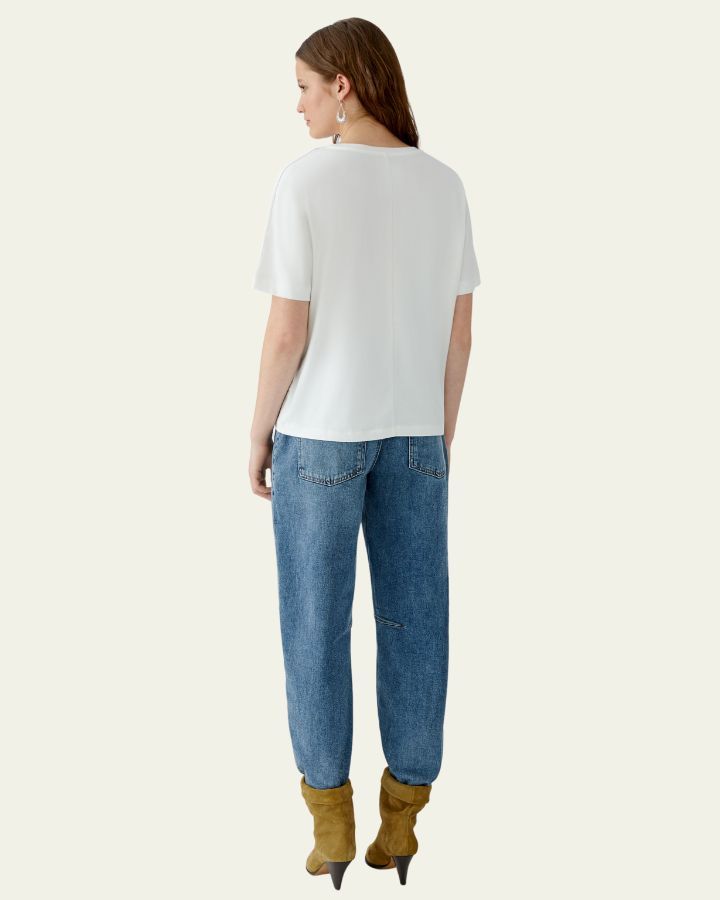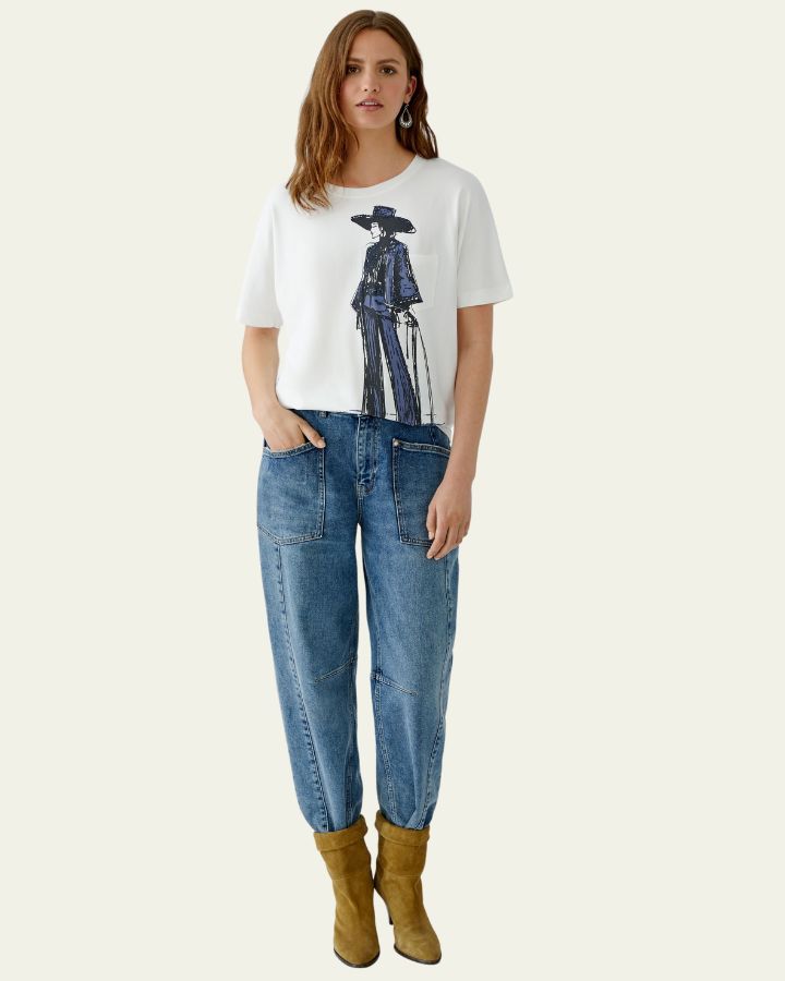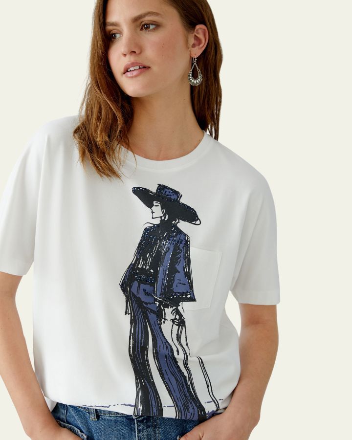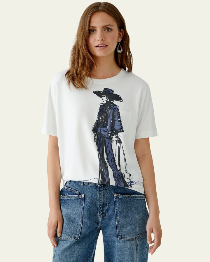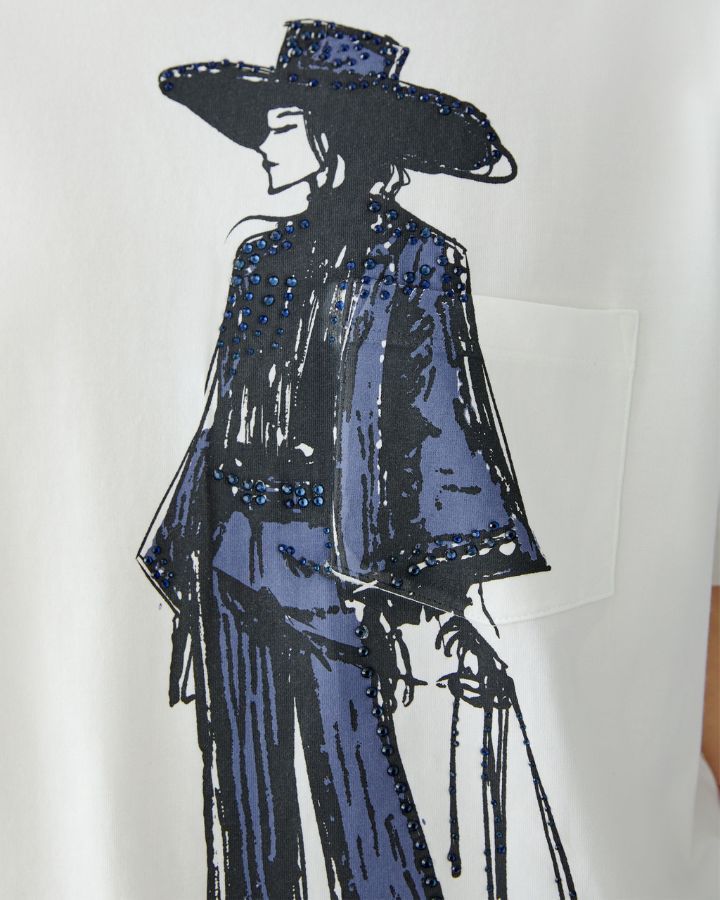 Ce t-shirt blanc se démarque par une illustration artistique audacieuse : une silhouette stylisée au large chapeau et manteau long, esquissée en bleu et noir. Sa coupe décontractée et ses manches courtes offrent un confort optimal, tout en affirmant un style original. Parfait avec un jean ou un pantalon habillé, il apporte une touche créative à un look casual chic. Un modèle idéal pour exprimer sa personnalité avec style.