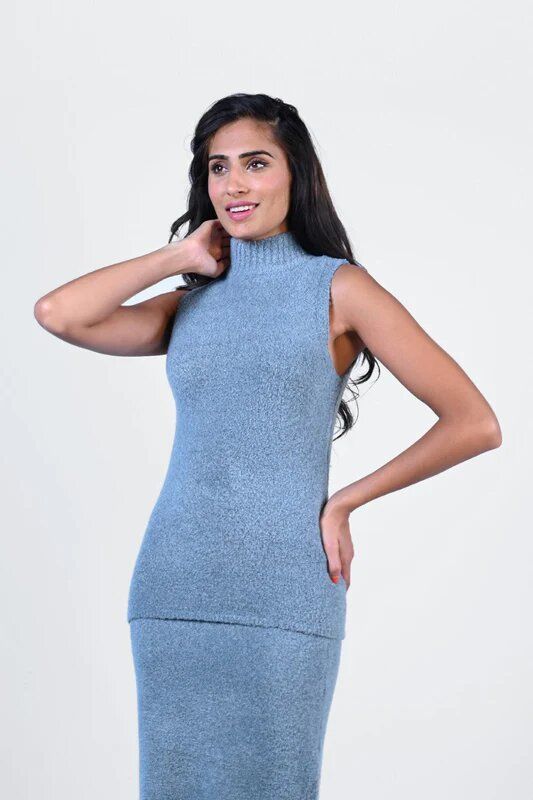 Chandail sans maches, col montant, coupe droite.