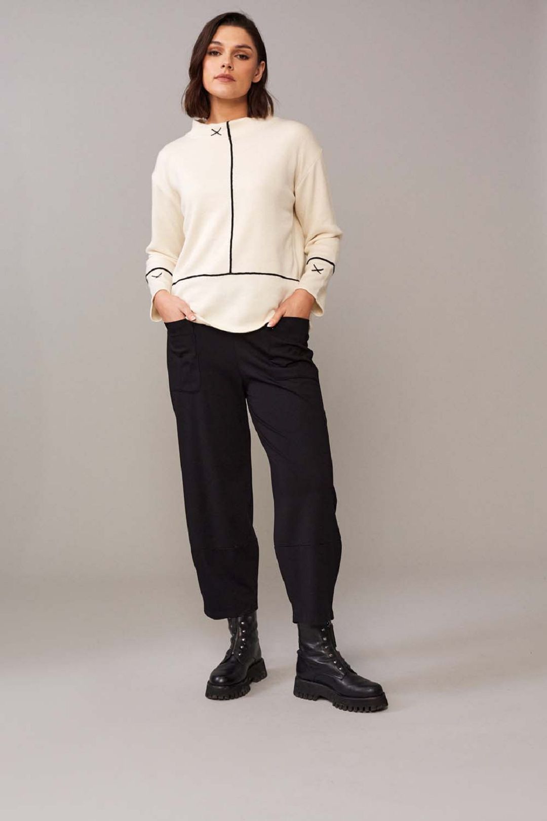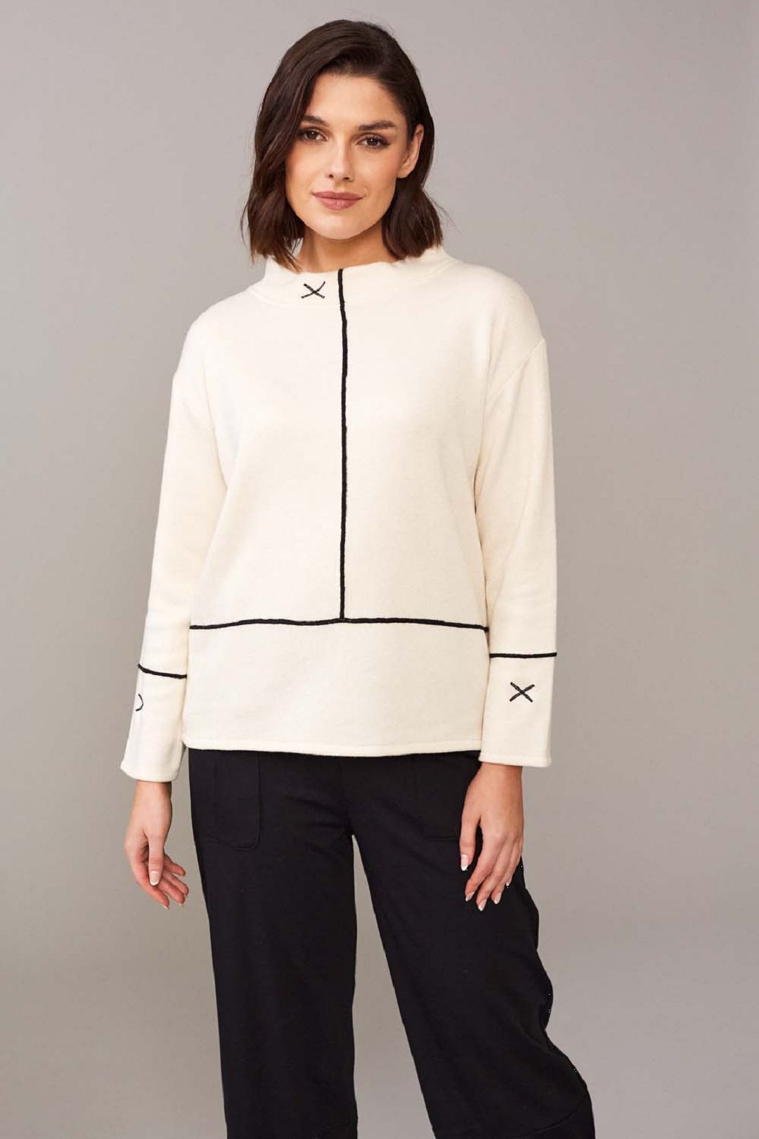 Beau chandail, col montant, coupe droite, lignes contrastantes.