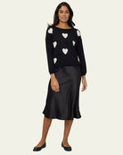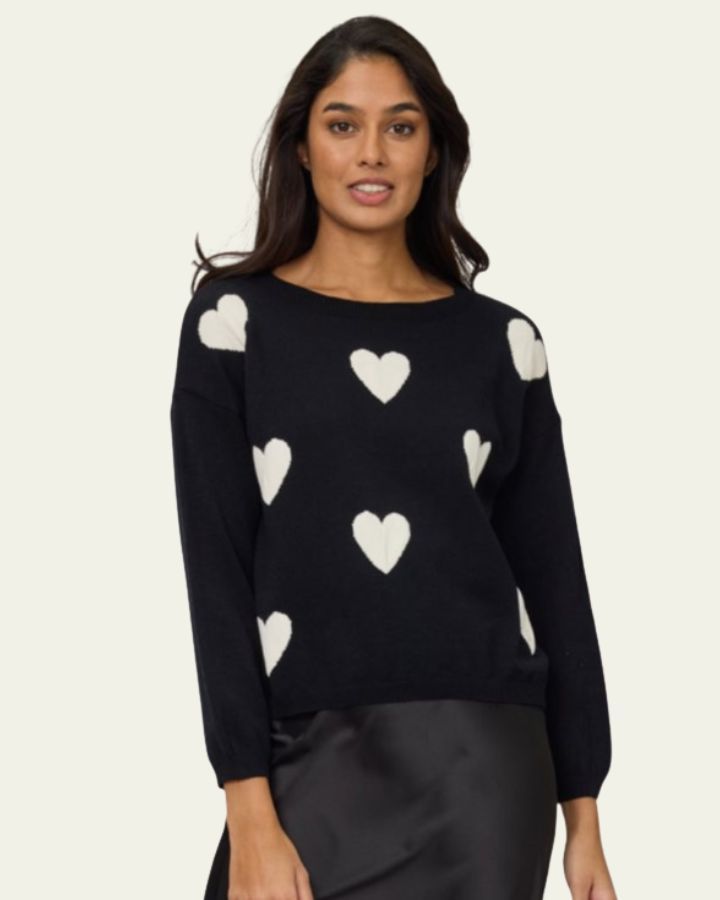 Ce pull noir orné de cœurs blancs dispersés apporte une touche de charme et de fantaisie à ta garde-robe. Avec sa coupe légèrement ample, ses manches longues et son encolure ronde classique, il allie confort et style décontracté. Facile à assortir, il se porte aussi bien avec un jean pour un look casual qu’avec une jupe pour une allure plus féminine. Un essentiel coup de cœur pour réchauffer tes tenues avec originalité.