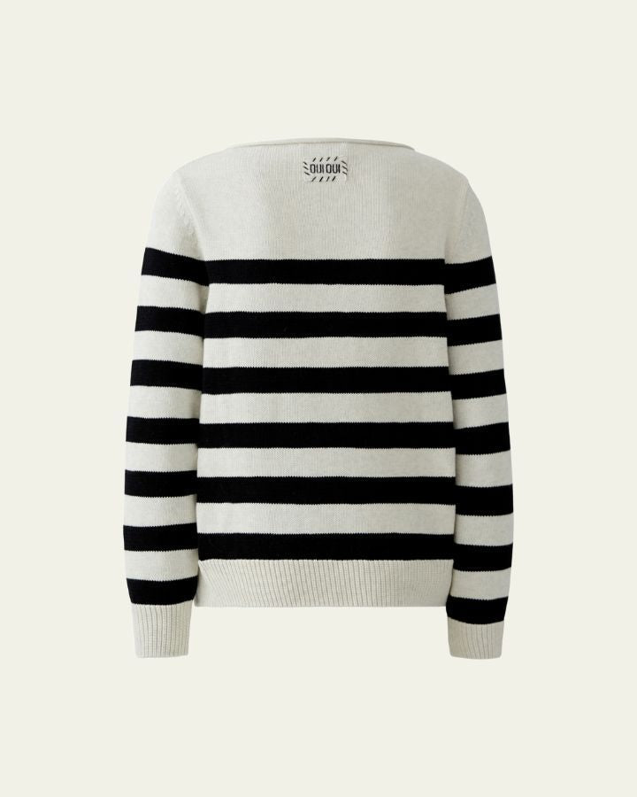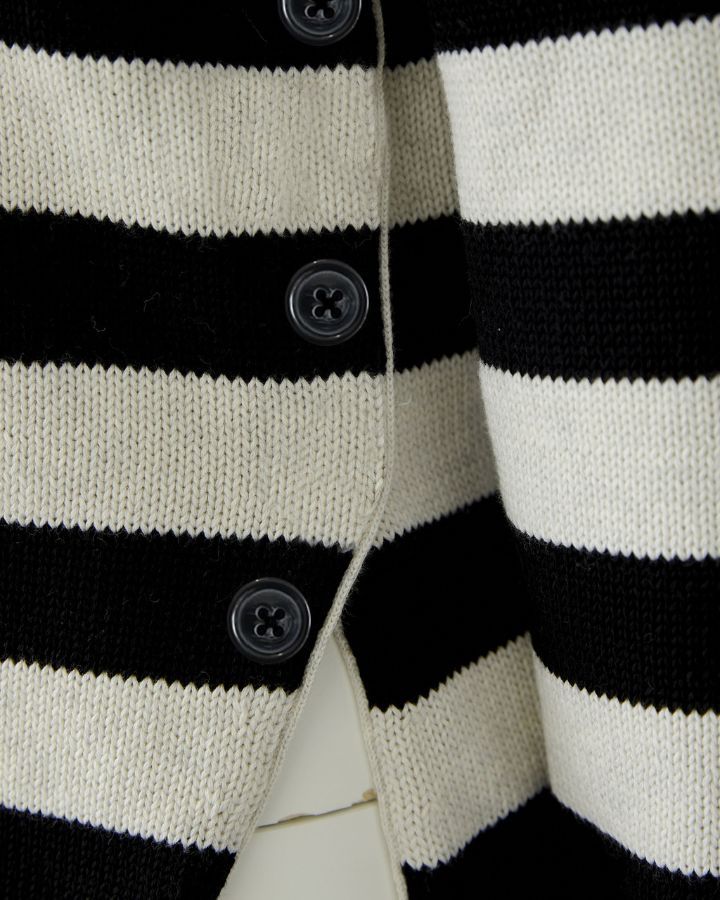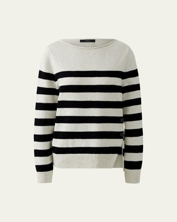Ce haut à rayures noires et blanches revisite le style marin avec une touche moderne. Doté d’un col rond élégant et de manches longues, il se démarque par ses boutons décoratifs noirs sur le coté qui ajoutent une note sophistiquée. Confectionné dans une maille douce et confortable, il est idéal pour un look casual chic au quotidien. Facile à associer avec un jean ou un pantalon habillé pour une silhouette soignée.