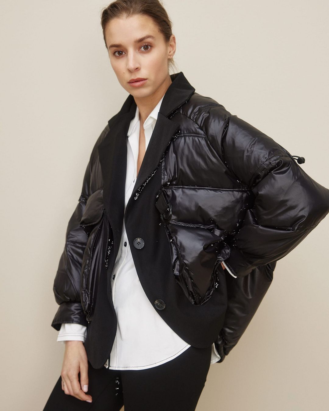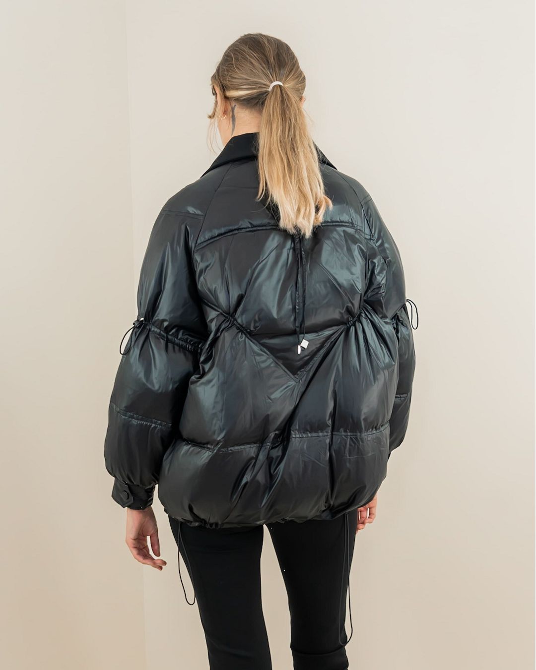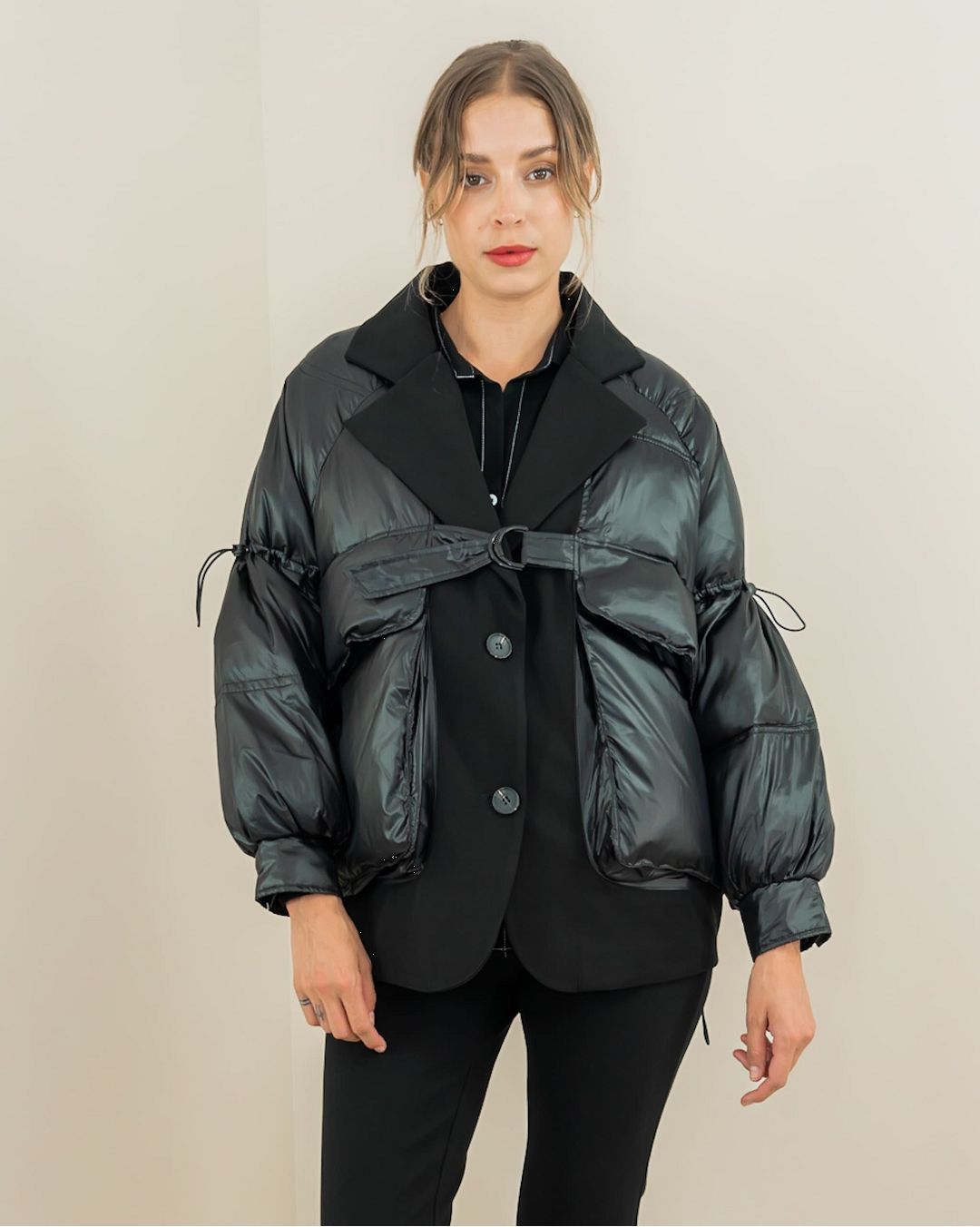 Manteau doudoune court. Poches cargo au devant. Comprend un ceinture ainsi que des détails d’élastiques. Fermeture à boutons.