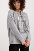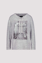 Beau chandail, manche longue, col montant lâche avec cordon, imprimé argenté au devant.