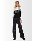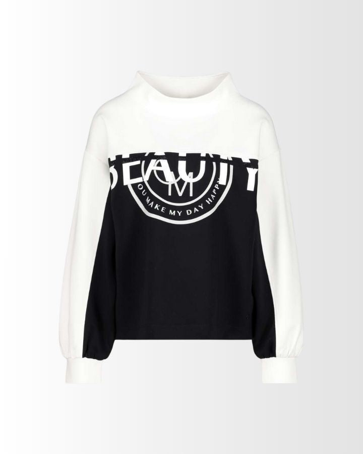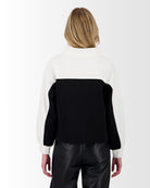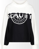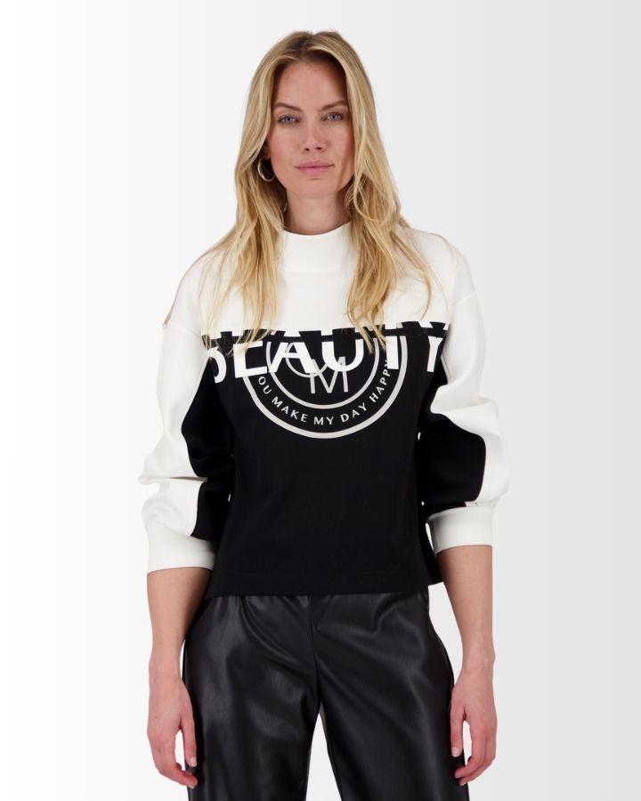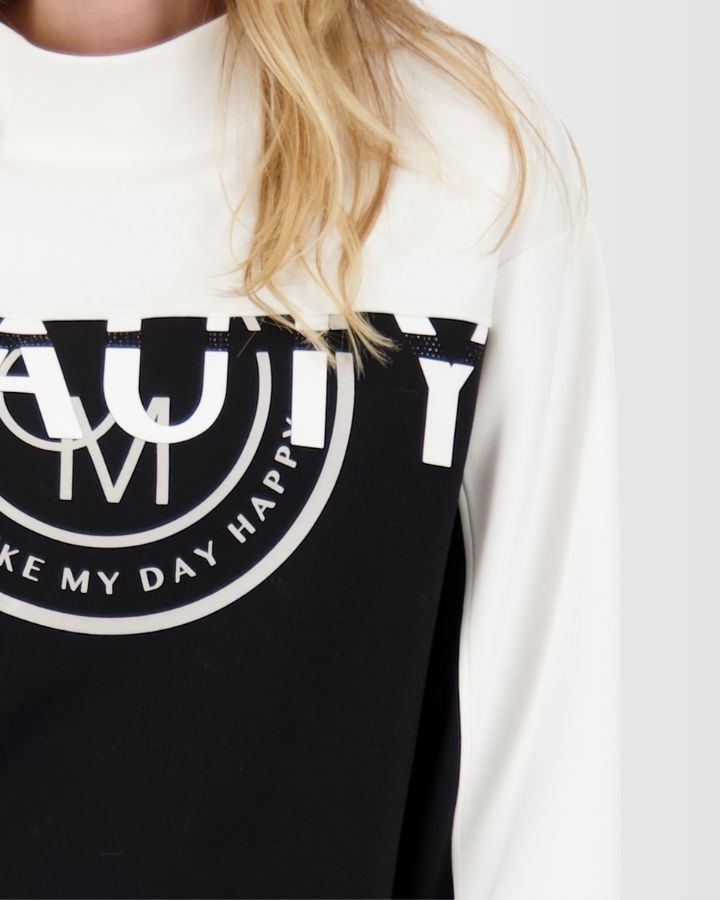 Ce sweat-shirt à manches longues joue sur les contrastes avec un design noir et blanc ultra moderne. Le haut, incluant le col montant et les manches, est d’un blanc éclatant, tandis que le bas est noir profond, créant une silhouette graphique et affirmée.