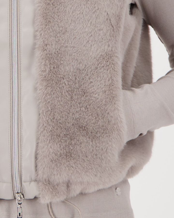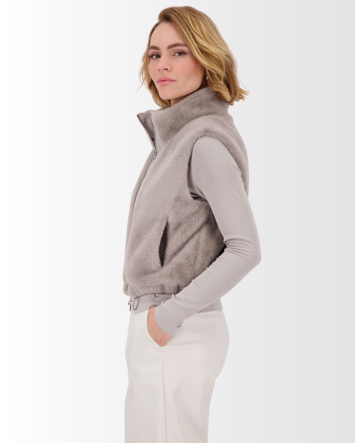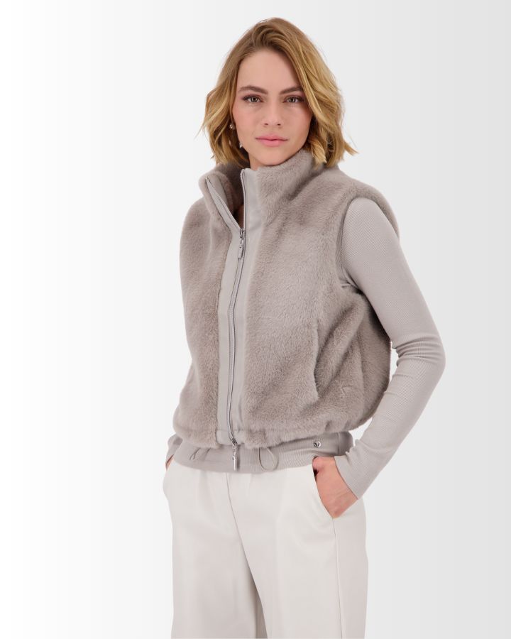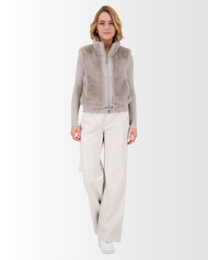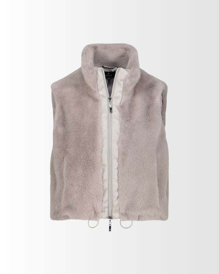 Ce haut sans manches en fausse fourrure greige allie douceur et élégance pour un look raffiné et confortable. Doté d'une fermeture éclair centrale et d’un col montant, il offre une allure moderne tout en gardant au chaud. Sa texture pelucheuse et sa coupe légèrement ajustée en font une pièce idéale pour les journées fraîches. Parfait à superposer sur un haut à manches longues, il s’adapte aussi bien à un style casual qu’à une tenue chic. Un indispensable de mi-saison pour une touche cosy et tendance.