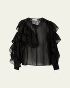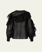 Cette blouse noire légère incarne l’élégance avec ses volants superposés et son tissu transparent au tombé aérien.