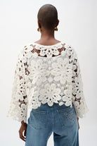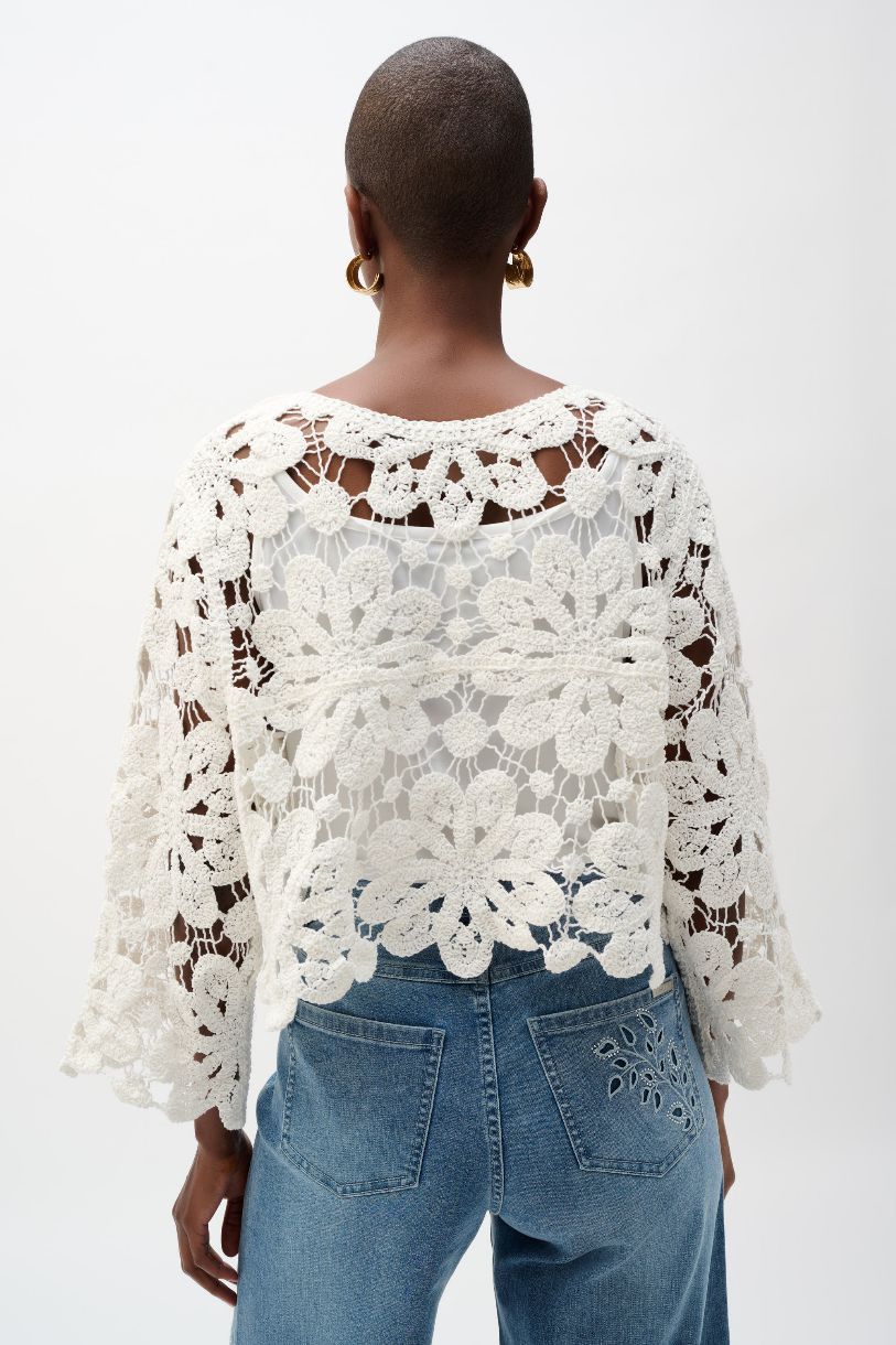 Un cardigan boxy en tricot de coton avec des détails en crochet, des manches trois-quarts et des boutons ton sur ton pour une tenue classique et polyvalente.