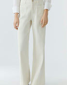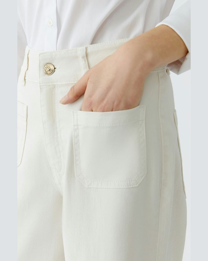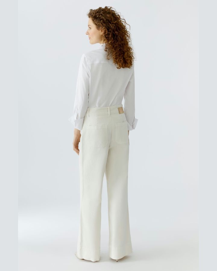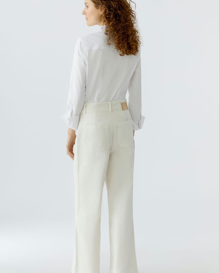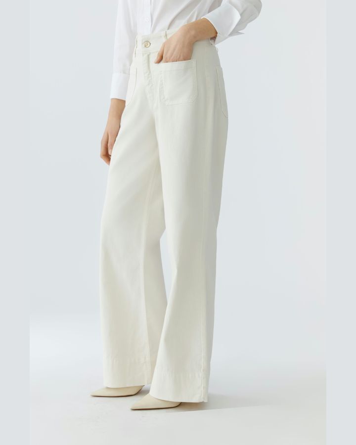 Denim clair avec jambes larges et poches plaquées. Denim en coton élastique, lavé. Taille haute, longue. Taille extensible en denim avec passants de ceinture, bouton et fermeture éclair. Quatre poches plaquées. Jambe détendue, légèrement évasée. Longueur à la grandeur 36 : 84 cm.