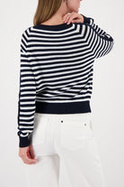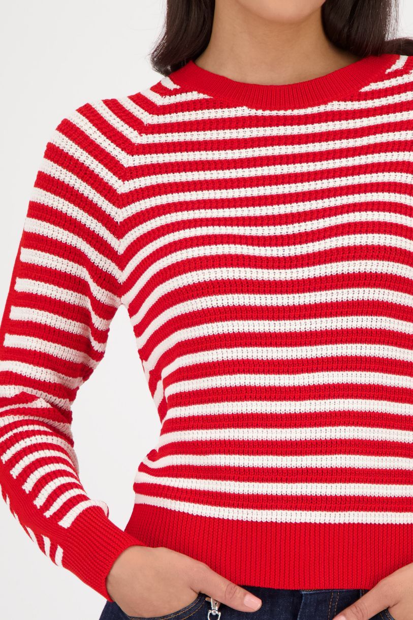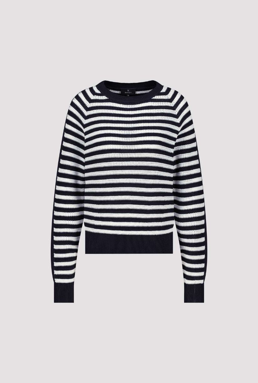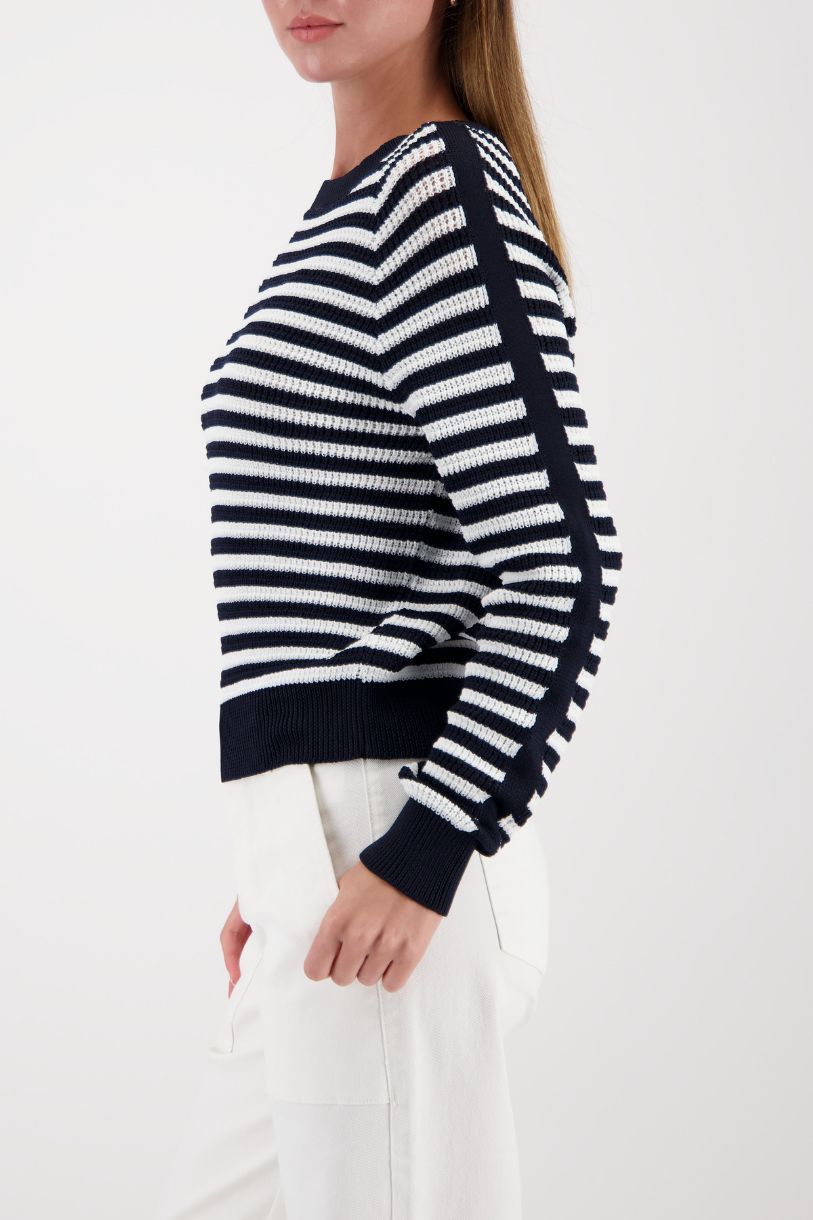 Pull élégant en maille fluide viscose, à col rond et orné d'une rayure stylée sur la manche pour un look moderne. Viscose fluide, coupe classique, encolure ronde, manches longues, détail rayé sur la manche