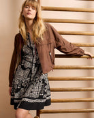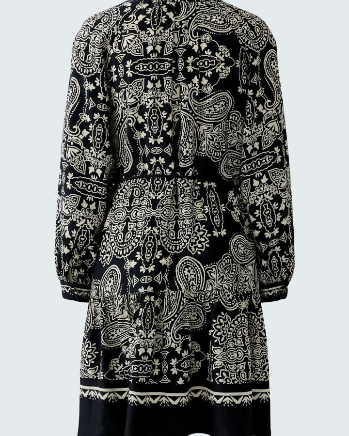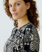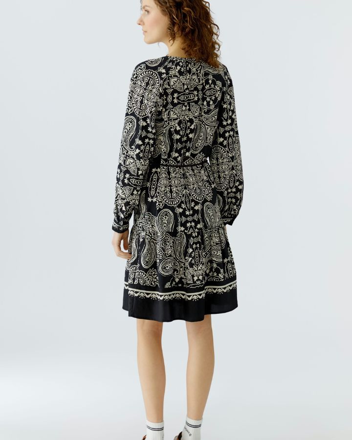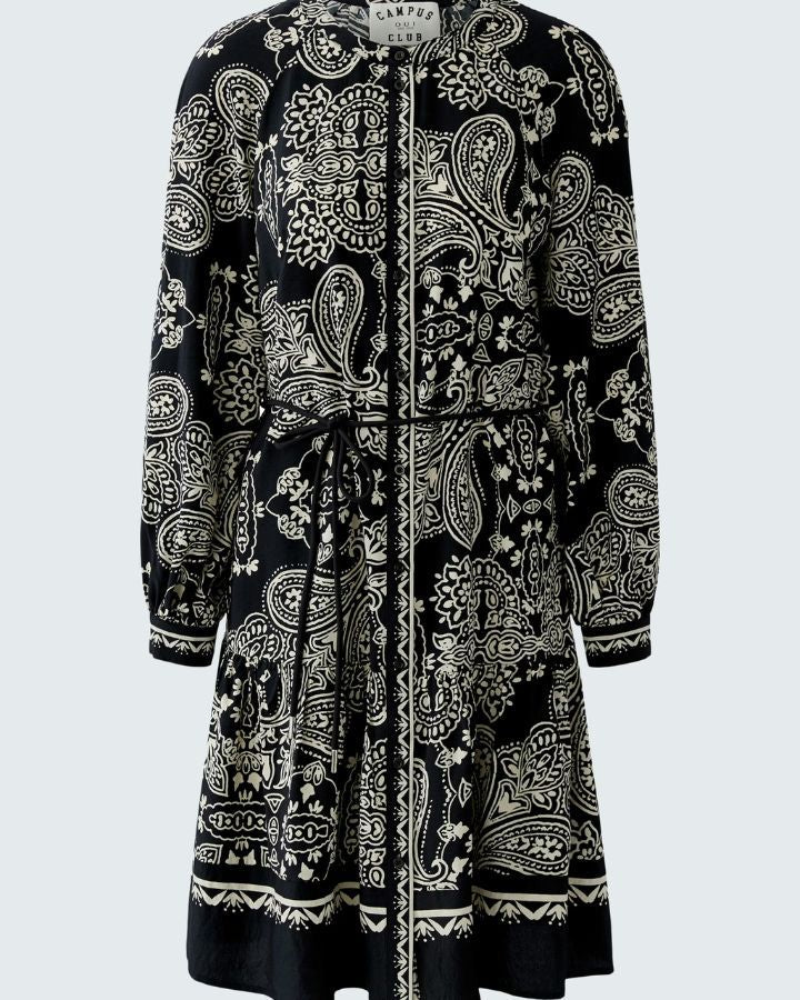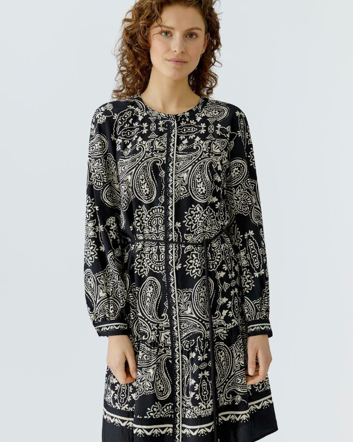 Robe féminine - le motif paisley et le volant incorporé soulignent le style Boho moderne. Mélange de viscose avec un motif paisley en bicolore. Coupe décontractée, longueur mini. Encolure ronde avec un fin liseré, boutonnière continue. Forme raglan avec manches longues, poignet avec bouton. Poches latérales. Boucles latérales avec ceinture en cordon et extrémité en métal. Longueur pour la taille 36 : 90 cm.