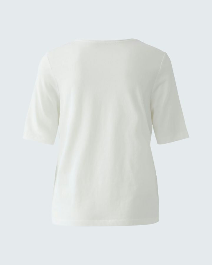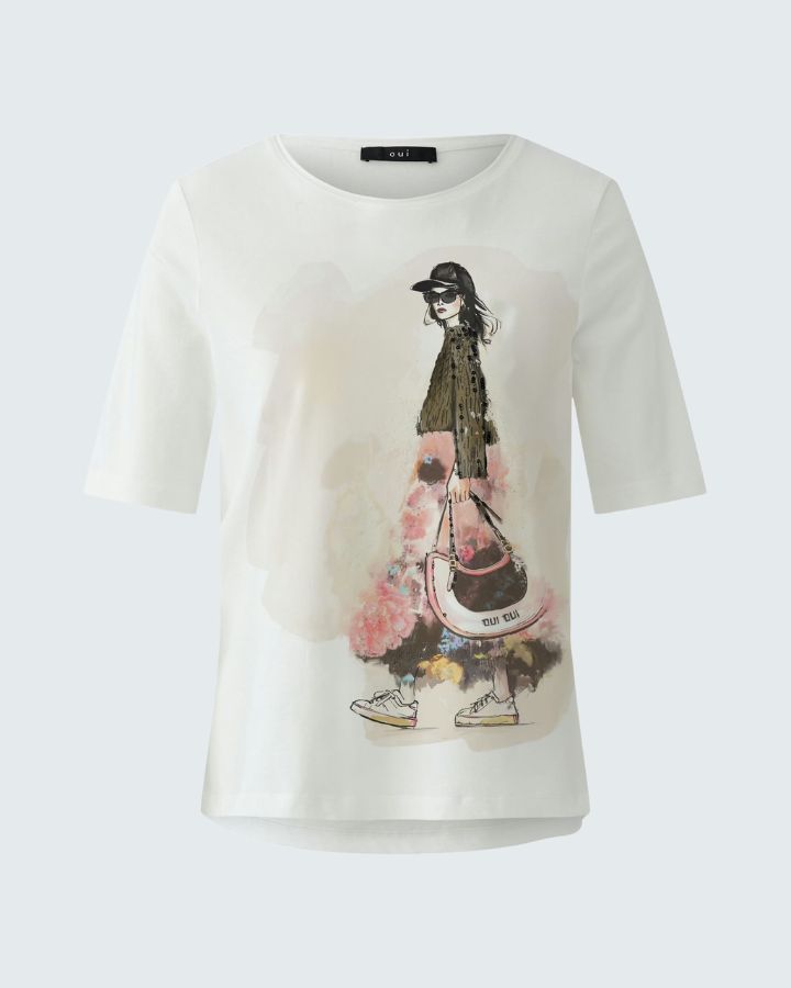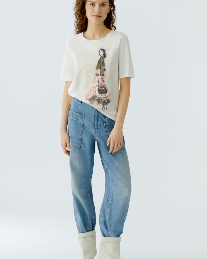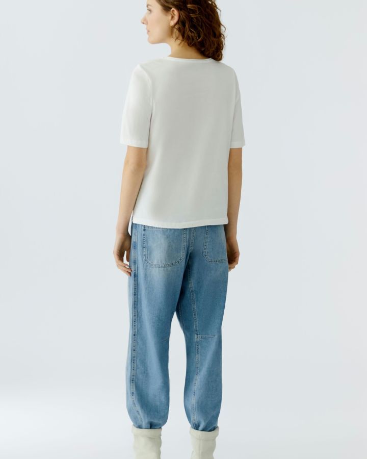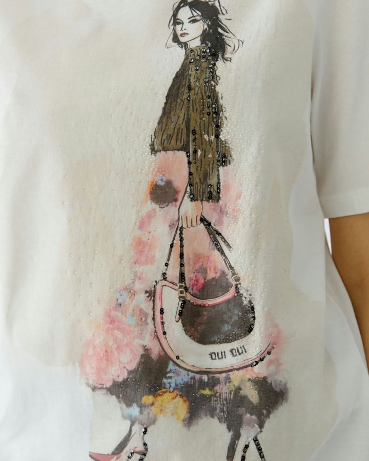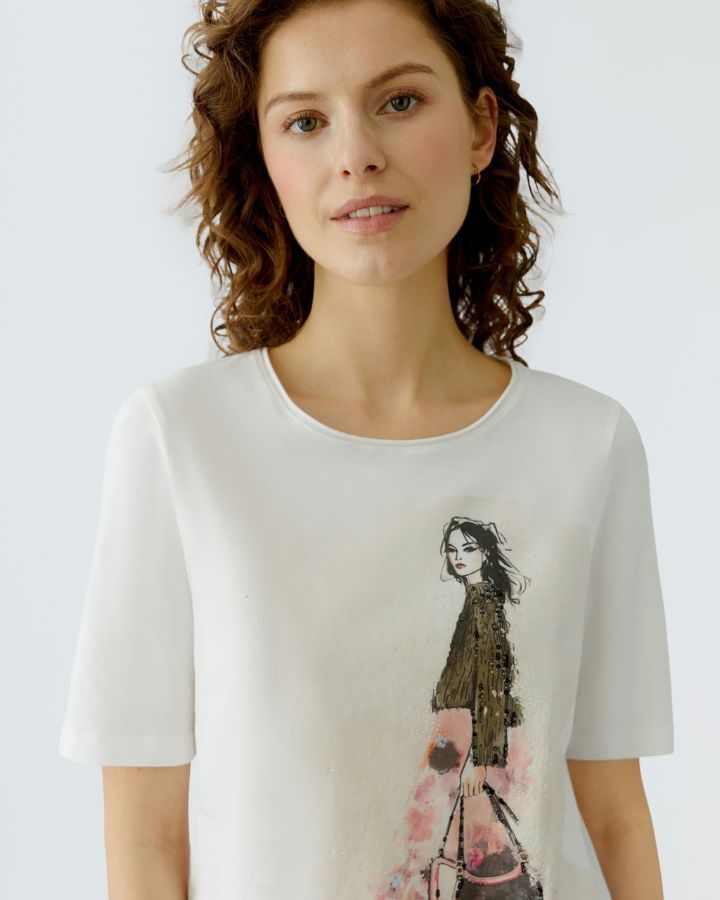 T-shirt avec motif dessiné à la main, richement décoré de strass. 100% coton bio avec impression située. Coupe droite, longueur régulière. Col rond avec bord. Manches courtes droites. Petites fentes aux coutures latérales. Longueur pour la taille 36 : 60 cm.