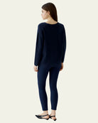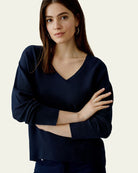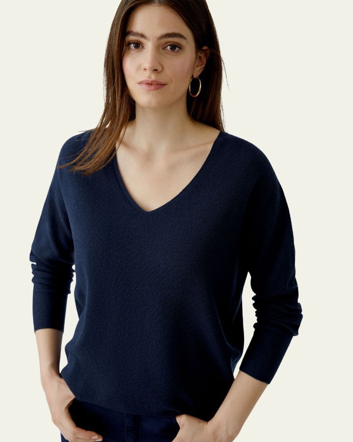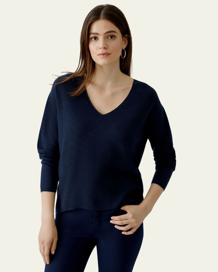 Ce haut en maille bleu marine séduit par son élégance simple et sa coupe décontractée. Son col en V met en valeur le port de tête, tandis que les manches longues ajustées aux poignets offrent confort et structure. Confectionné dans un tricot doux et fluide, il tombe juste au-dessus des hanches pour une silhouette équilibrée. Facile à associer, il se porte aussi bien avec un jean qu’un pantalon habillé. Un basique chic et polyvalent, entre confort et intemporalité.