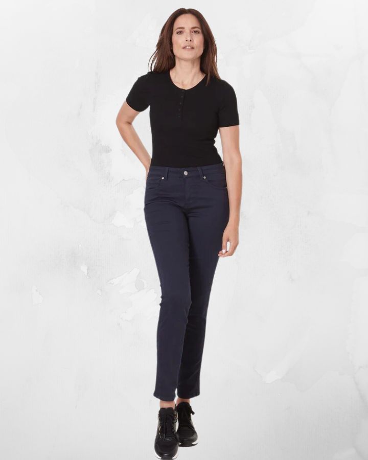 Jeans, taille mi-haute, jambe étroite, modèle 5 poches.