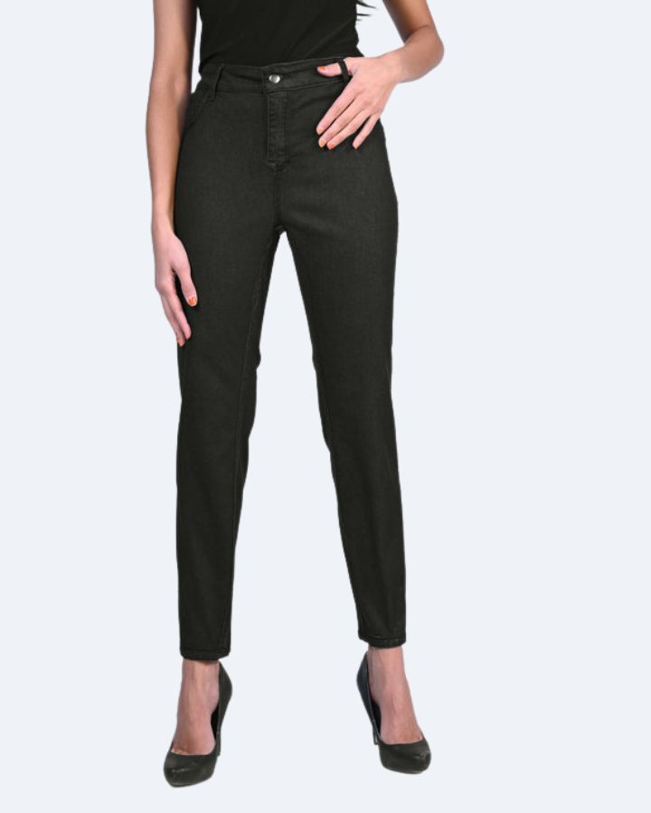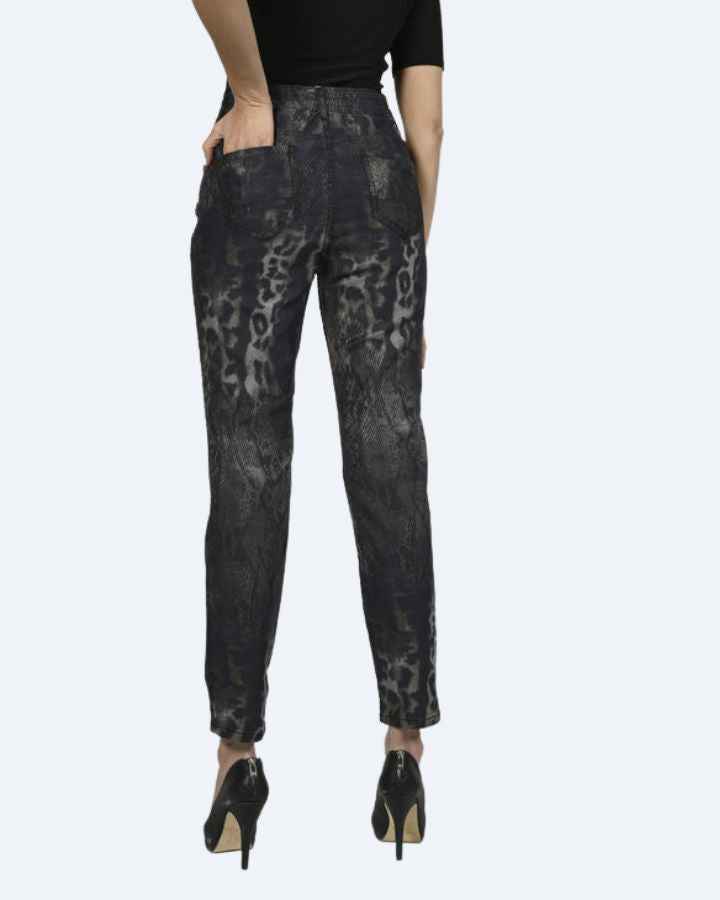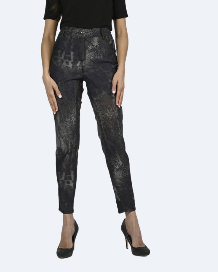 Beau jeans réversible, coupe droite, fausses poches avant, poches plaquées à l'arrière, imprimé animal d'un côté et noir uni de l'autre! Composition: 65% coton, 33% polyester, 2% élasthanne.