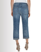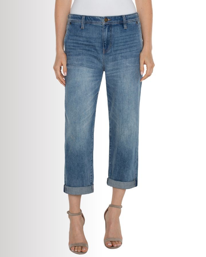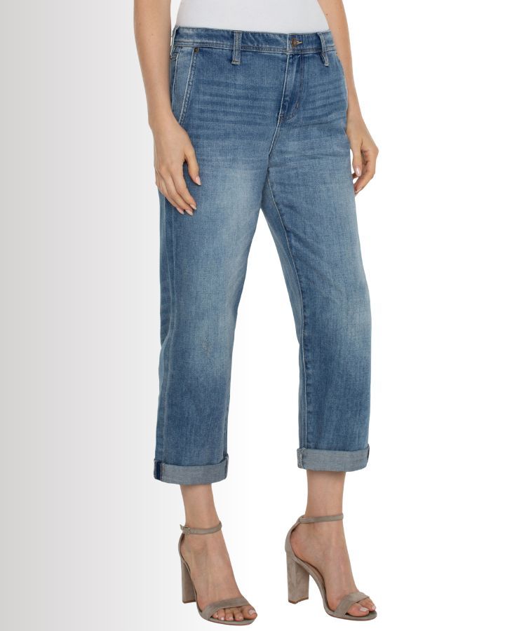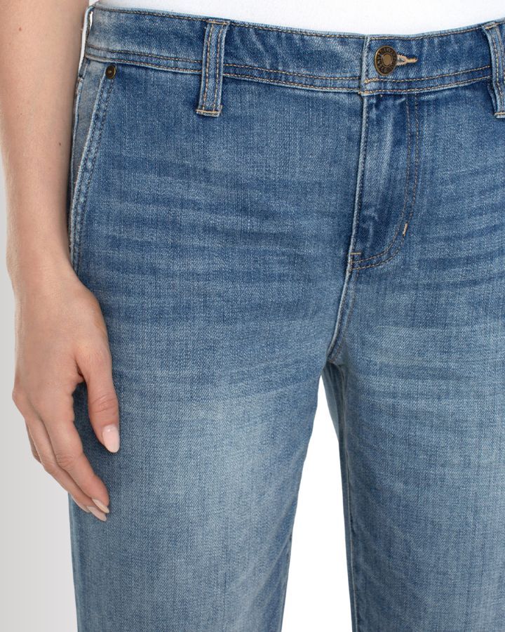 Ce jean bleu style délavé à coupe droite est parfait pour un look décontracté et moderne. Il présente un ourlet retroussé au niveau des chevilles, ajoutant une touche de style et de nonchalance. La taille moyenne avec fermeture à bouton et braguette à glissière assure un ajustement confortable et sécurisé. Les passants pour ceinture offrent la possibilité de personnaliser le look avec une ceinture de votre choix. Les poches avant pratiques et l'effet légèrement usé au niveau des cuisses et des genoux apportent une esthétique vintage et tendance. Ce jean peut être facilement associé à un t-shirt ou un haut léger pour un look casual chic.