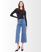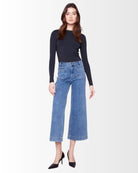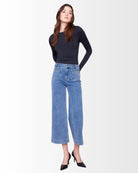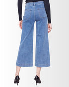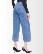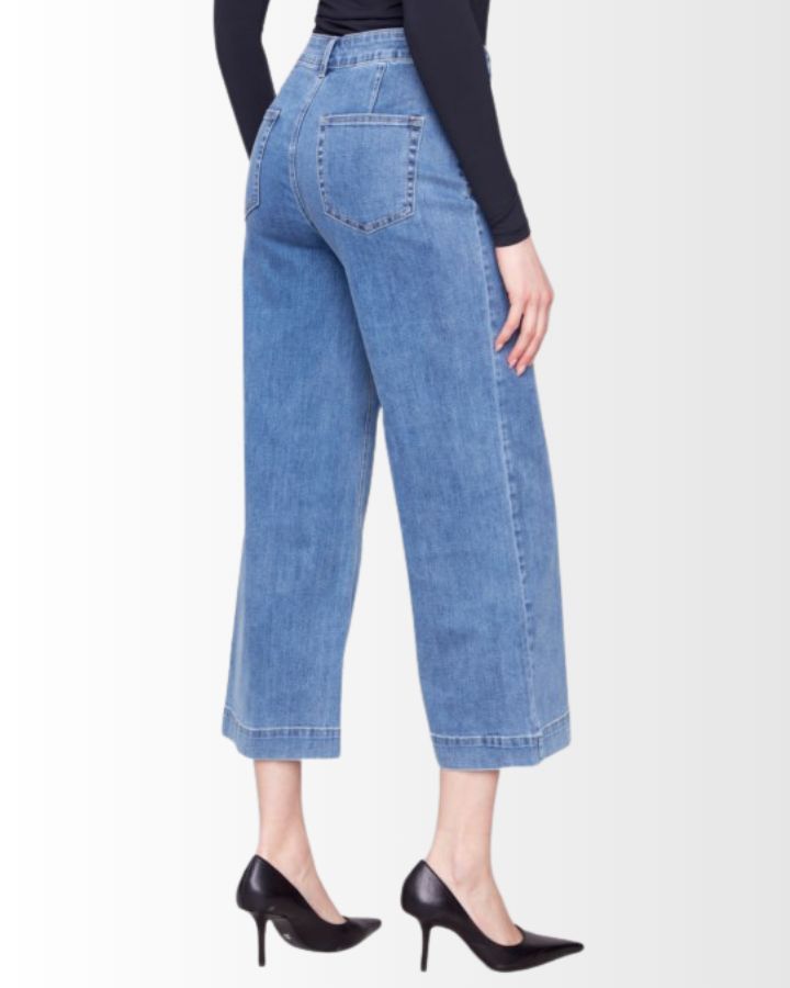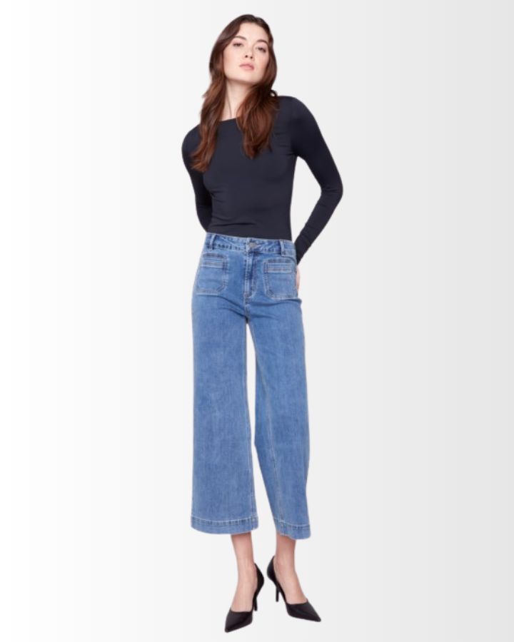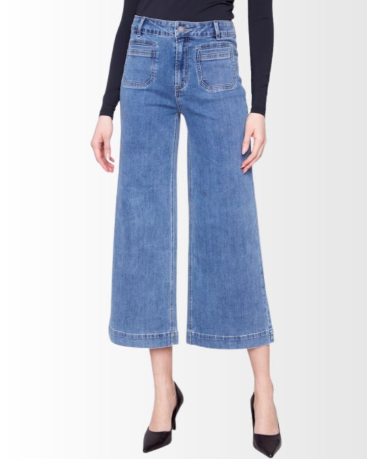 Ajoutez une touche rétro-chic à votre garde-robe avec ce pantalon en denim stretch à jambes évasées. Sa coupe raccourcie met en valeur la cheville, idéale pour vos sandales ou bottines préférées. Les poches plaquées à l’avant apportent une note utilitaire tendance. Confortable et flatteur, il épouse les courbes tout en offrant une belle liberté de mouvement. Parfait pour un look casual ou sophistiqué selon l’envie.