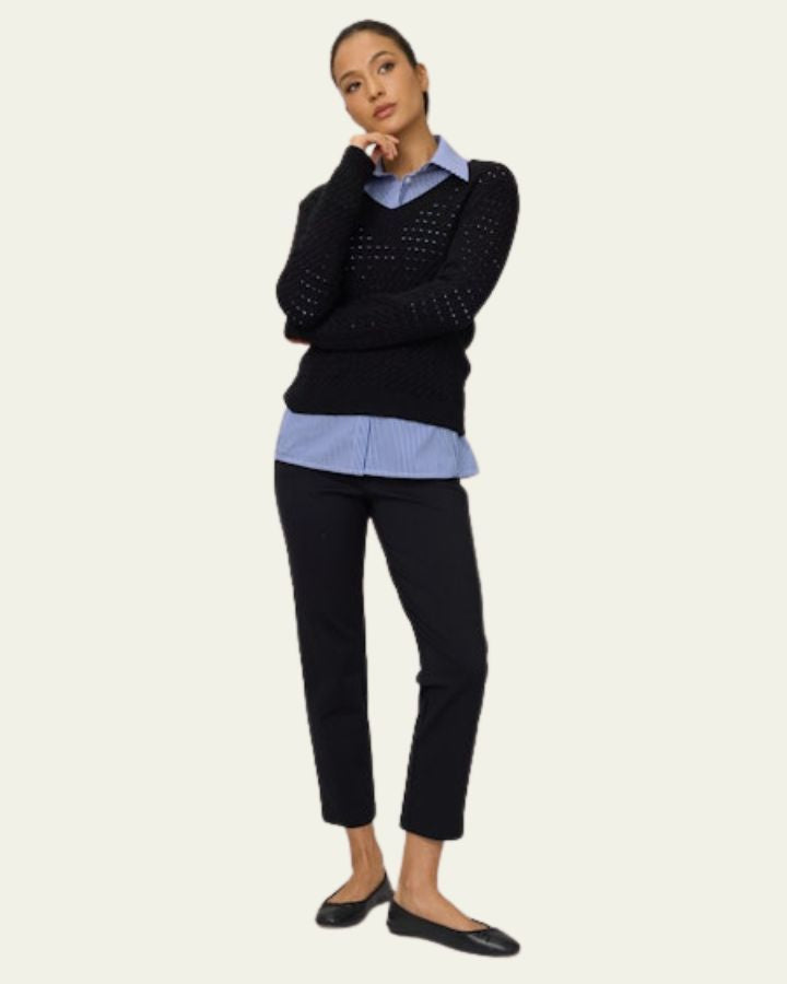Opte pour une silhouette chic et minimaliste avec ce pantalon noir à la coupe droite ajustée. Sa longueur 7/8 dévoile subtilement les chevilles pour une allure moderne et élancée. Confectionné dans un tissu lisse et structuré, il offre à la fois confort et maintien, parfait pour passer d’une journée de travail à une sortie en soirée sans fausse note. Un indispensable à associer avec une chemise fluide, un pull oversize ou un blazer ajusté selon l’occasion.
