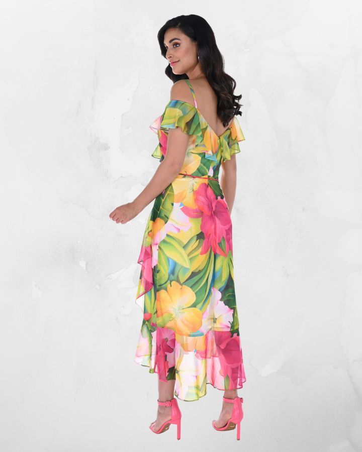 Si vous aimez les styles vibrants, vous craquerez sans doute pour cette robe Frank Lyman, un look qui a tout pour plaire. Dotée d'un motif d'hibiscus de rêve, cette robe en mousseline légère présente des détails de volants gracieux le long des épaules et sur son ourlet à plusieurs niveaux. Un lien doux cintre la taille pour créer l'apparence d'une silhouette plus définie tandis que de fines bretelles spaghetti maintiennent le look ensemble.