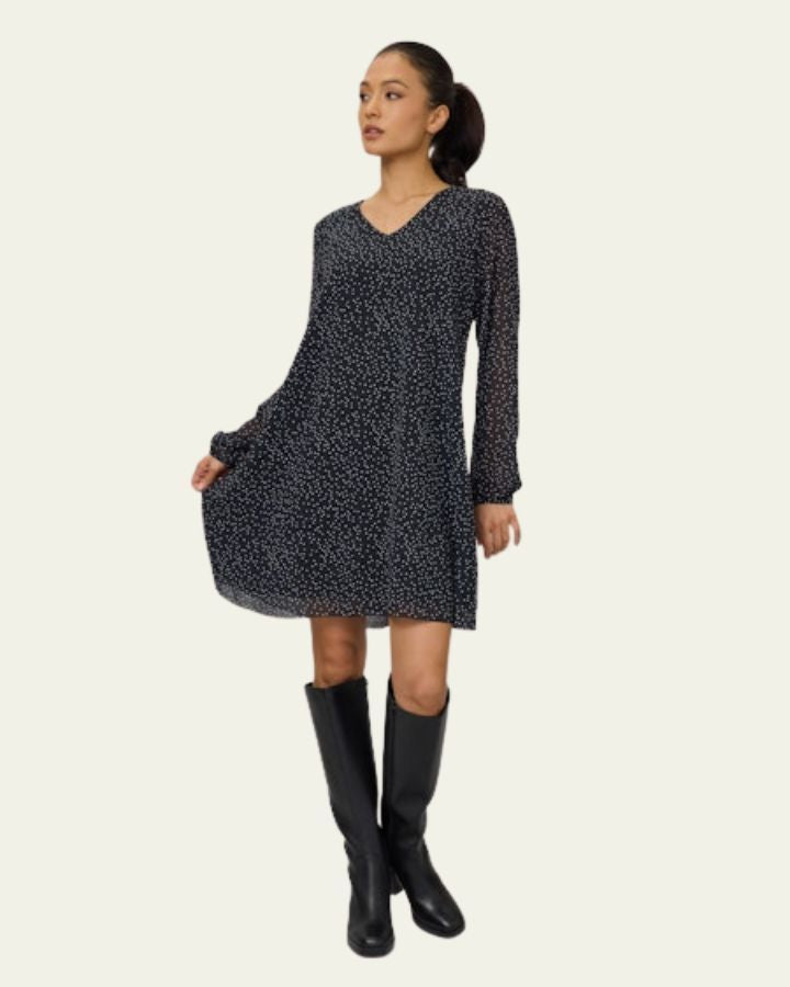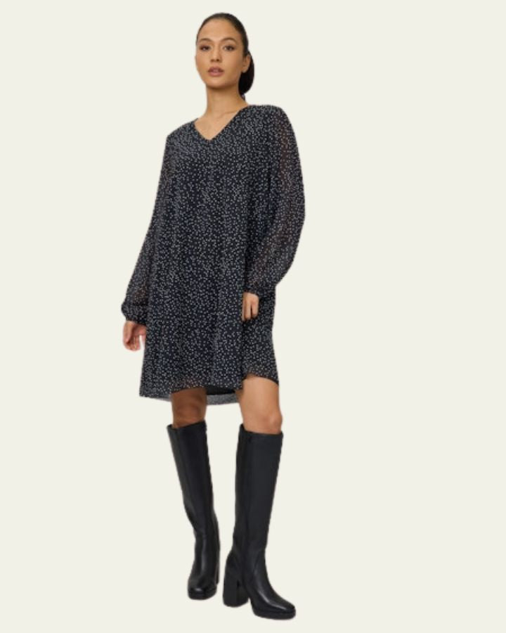 Affichez un style chic et sans effort avec cette robe noire à motifs blancs. Sa coupe fluide et sa longueur mi-cuisse créent un look léger et confortable, parfait pour toutes les saisons. Les manches longues légèrement bouffantes apportent une touche de romantisme moderne, tandis que l’encolure en V met subtilement en valeur le décolleté. Parfaite pour une journée en ville, un brunch entre amies ou une soirée décontractée, cette robe s’adapte à toutes vos envies. Portez-la avec des bottes hautes pour un look affirmé, ou optez pour des baskets blanches pour un style plus casual.