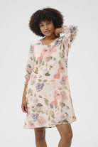 Cette robe fluide arbore un motif floral délicat dans des tons pastel de rose, violet et vert, idéal pour un look frais et estival. Avec son col en V raffiné et ses manches longues légèrement bouffantes, elle allie féminité et modernité. Sa coupe évasée sublime toutes les silhouettes tout en offrant un confort incomparable. Parfaite pour les journées décontractées ou les occasions spéciales, cette pièce incarne l'élégance naturelle et la légèreté.