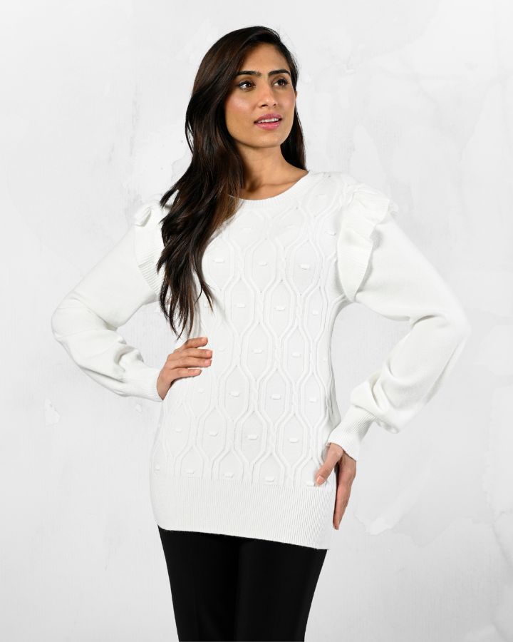 Beau chandail tricot à motifs, manche longue, volant à l'épaule, encolure ronde, bordures côtelées.