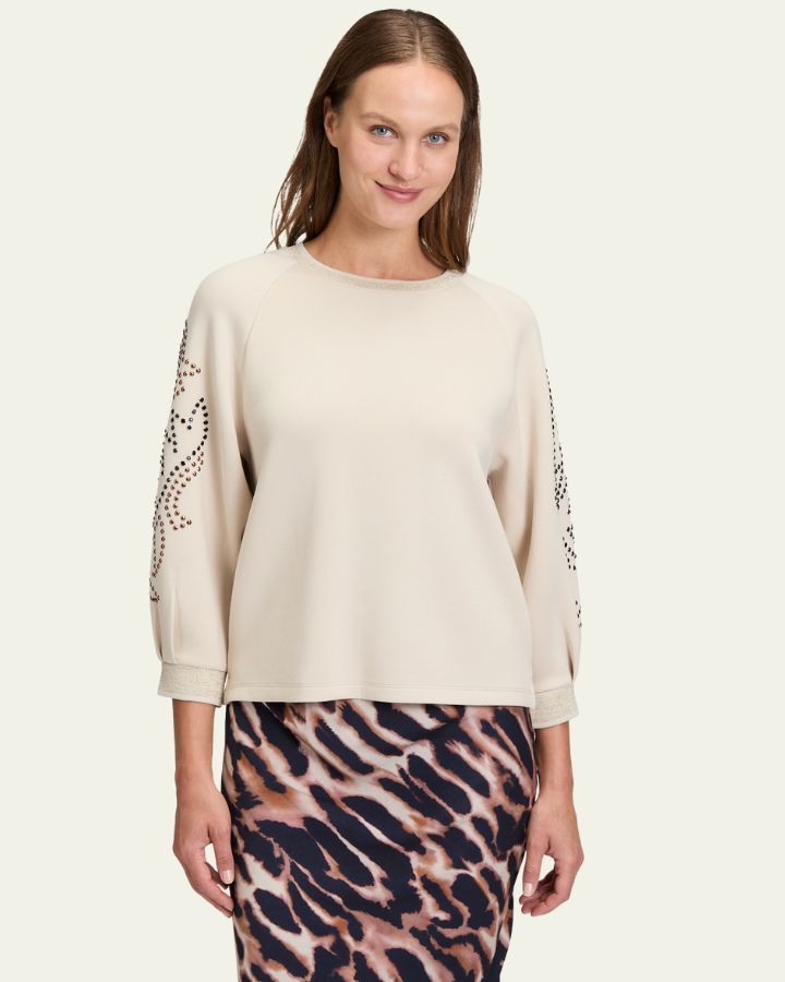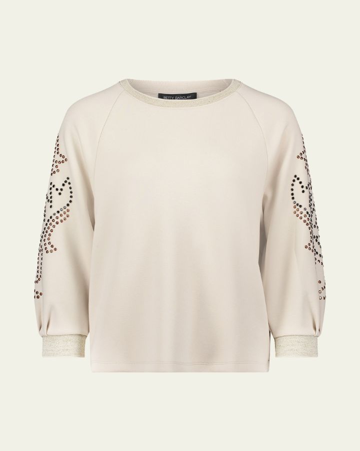 Ce sweat-shirt signé Betty Barclay incarne le raffinement à l’état pur. Ses manches trois-quarts sont sublimées par des ornements métalliques colorés noir et doré apportant une touche chic et tendance. Le col rond et les poignets côtelés assurent confort et tenue impeccable. Fabriqué dans une matière douce, il est idéal pour un look casual mais travaillé. À associer avec un pantalon classique ou un jean pour une allure stylée en toutes circonstances.