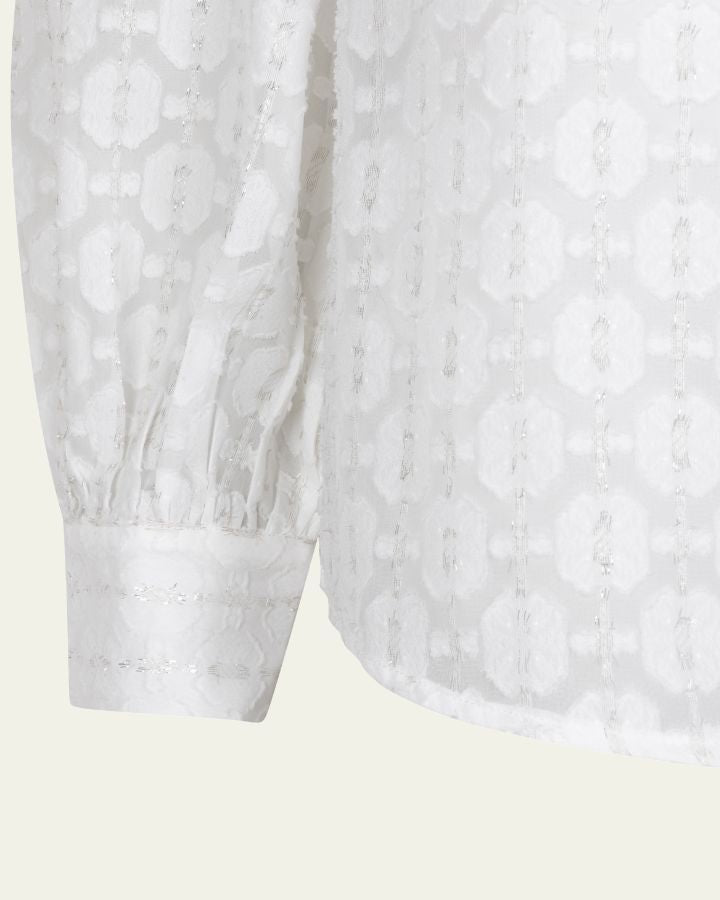 Cette blouse blanc cassé séduit par son élégance intemporelle et son délicat motif brodé aux inspirations géométriques. Son col montant et ses manches légèrement bouffantes apportent une touche de sophistication et de féminité. Les poignets boutonnés offrent une finition soignée tout en assurant un ajustement confortable. Confectionnée dans un tissu fluide et léger, elle garantit un tombé impeccable et une sensation agréable sur la peau. Idéale pour composer une tenue chic, elle s’associe harmonieusement à un pantalon habillé ou une jupe élégante. Une pièce incontournable du vestiaire féminin, alliant modernité, finesse et charme.