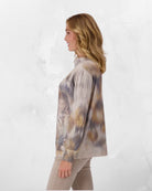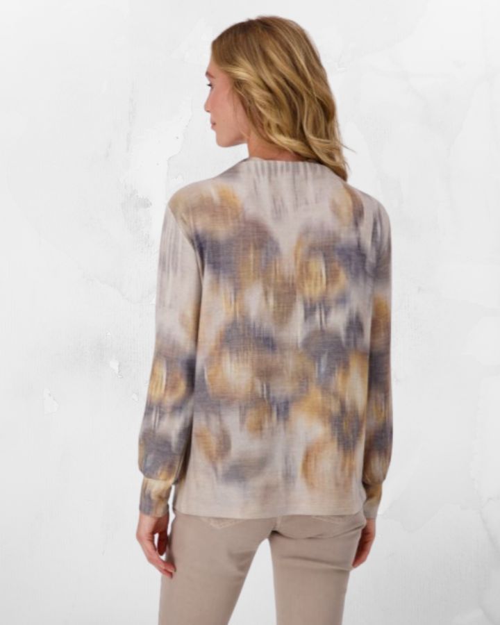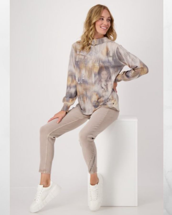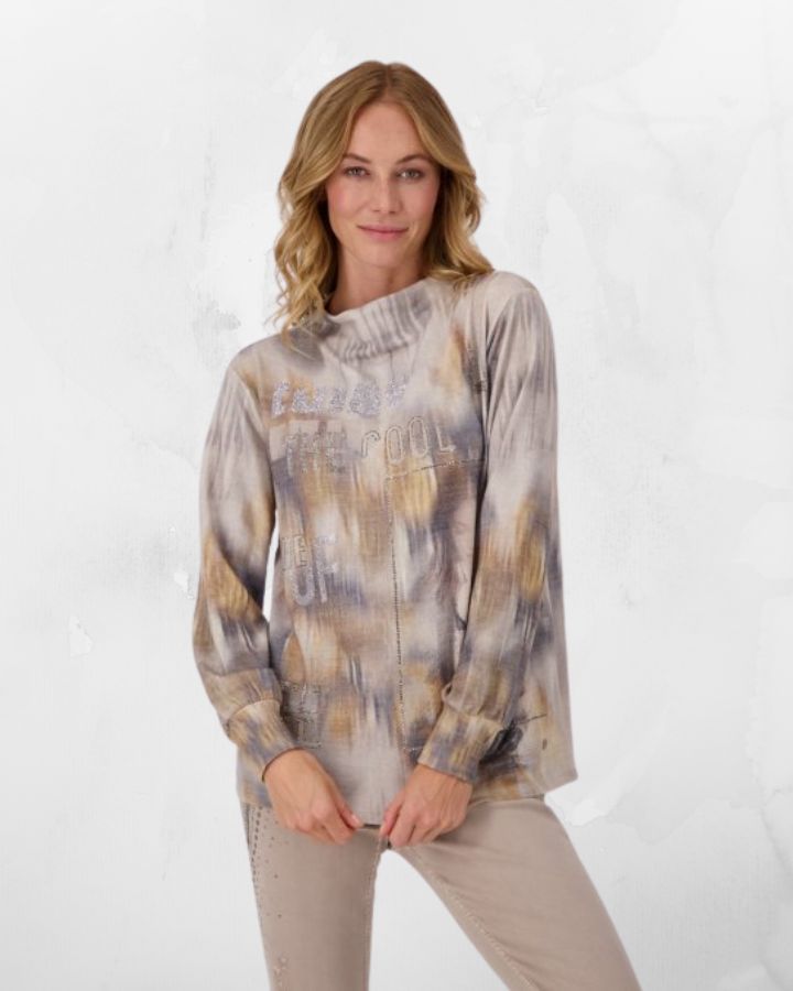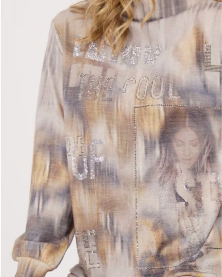 Chandail avec lettrage en pierres, col montant, manche semi bouffante.