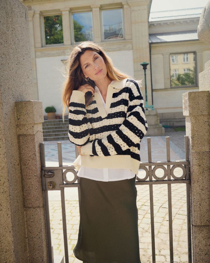 Ce pull est incontournable pour un style décontracté-chic. Confectionné dans une matière douce et légèrement extensible, il garantit un confort optimal. Le design moderne à rayures noires et blanches ajoute du dynamisme et un effet d'amincissement visuel. L'encolure en V et les manches longues offrent une silhouette élégante et polyvalente, idéale pour toute occasion. La coupe ajustée met en valeur la silhouette sans compromettre le confort. Que ce soit pour une sortie décontractée ou une journée de travail, ce pull s'accorde parfaitement avec un jean, une jupe ou même un pantalon habillé.