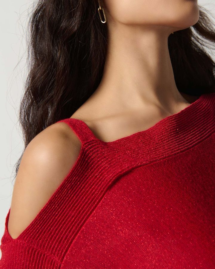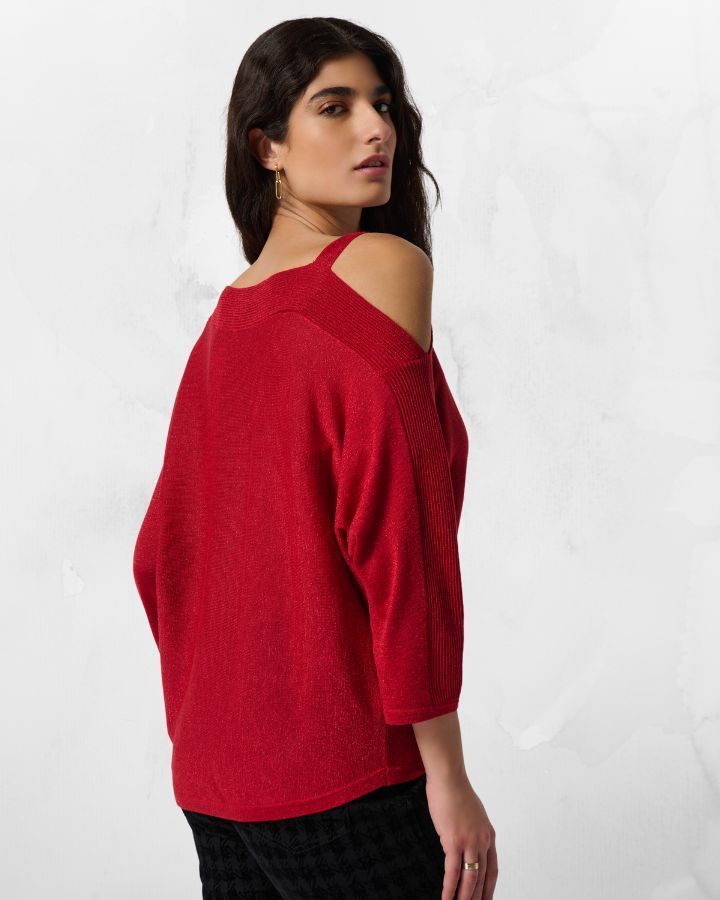Savourez le confort décontracté et l'élégance raffinée de ce haut à épaule dégagée. Sa confection en tricot doux et confortable et ses légères manches dolman créent une coupe décontractée. Pour créer une tenue à la fois élégante et sobre, complétez le style par un pantalon en faux cuir et des souliers à talons hauts.