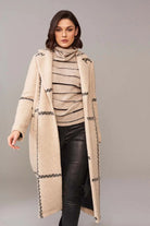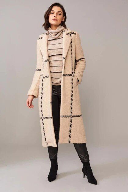 Beau manteau long, col cranté,deux boutons, lignes contrastantes.