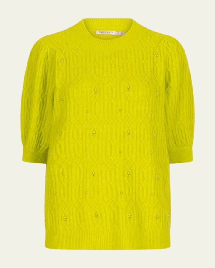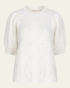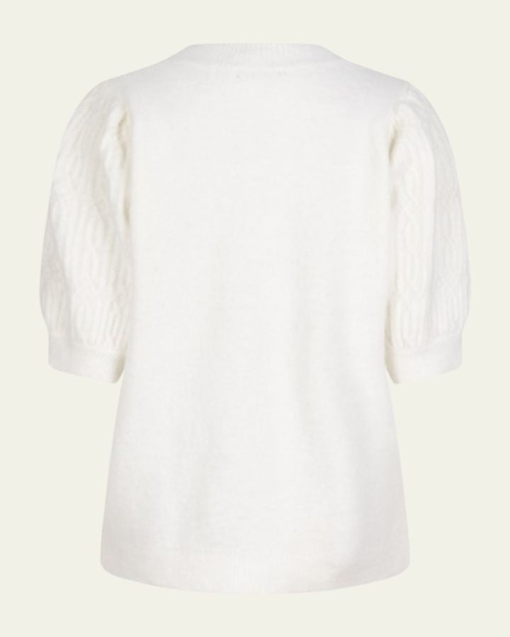 Ce pull à manches courtes incarne l’élégance avec son motif texturé en losanges entrelacés et ses détails raffinés. Les petites perles disposées sur le devant ajoutent une touche sophistiquée et délicate. Ses manches courtes et bouffantes apportent du volume et du caractère à la silhouette. Le tissu doux et structuré assure un confort optimal tout en mettant en valeur le design élégant. Facile à associer, il s’adapte aussi bien à un look chic qu’à une tenue plus décontractée. Un essentiel du dressing qui conjugue raffinement, modernité et confort avec subtilité.