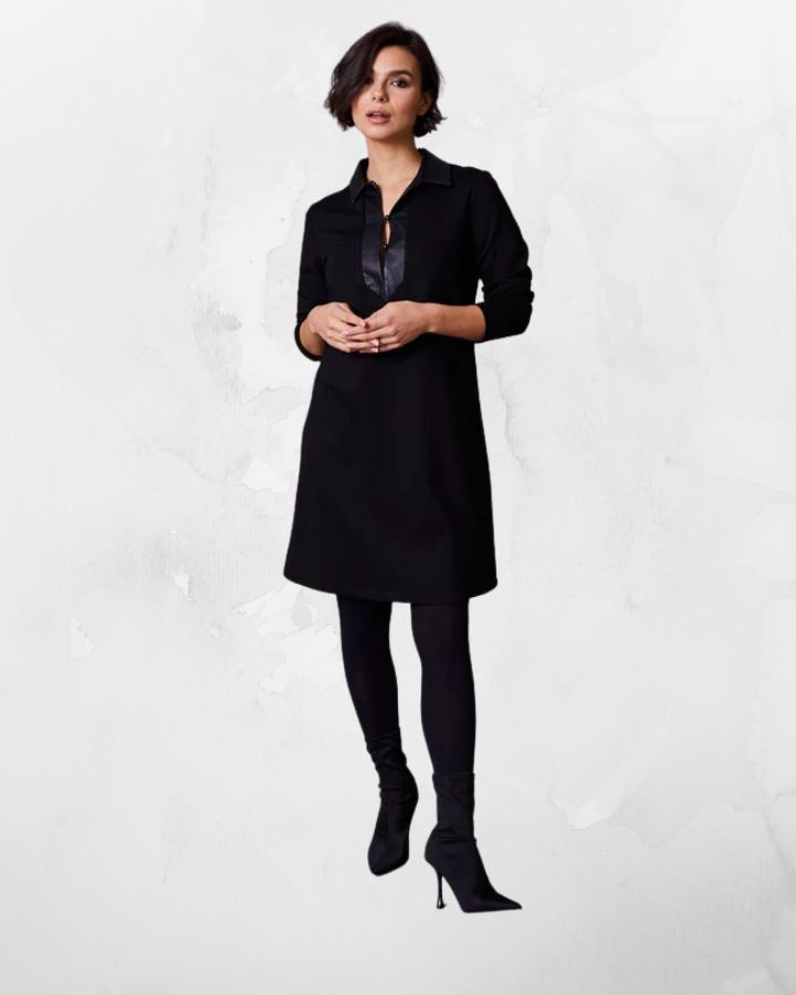 Découvrez notre magnifique robe à col en similicuir, un vêtement élégant et moderne qui ajoutera une touche de sophistication à votre garde-robe. Cette robe s'arrête au genou, ce qui la rend parfaite pour les occasions formelles ou professionnelles. Le col en similicuir ajoute une touche de texture et de contraste au tissu doux de la robe.