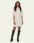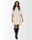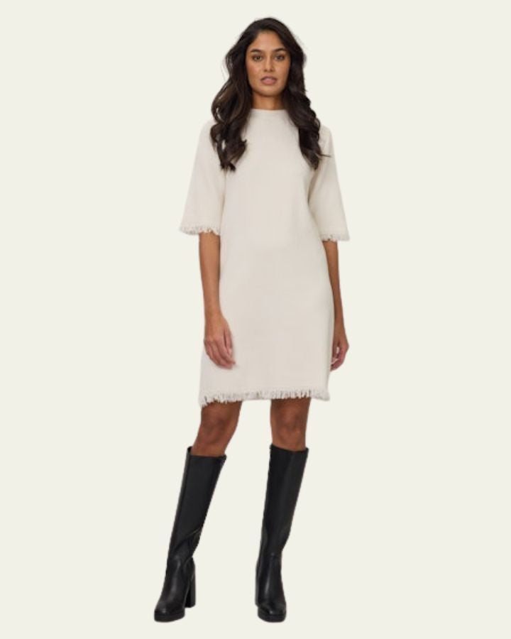 Laisse-toi séduire par la pureté de cette robe droite, parfaite incarnation de la sobriété chic. Son col rond et ses manches mi-longues soulignent une silhouette épurée, tandis que les franges délicates au bas des manches et de l’ourlet ajoutent une note de légèreté et de mouvement. Confortable et raffinée, elle se porte aussi bien avec des bottes hautes pour un look urbain que des sandales pour une allure plus estivale. Une pièce idéale pour celles qui aiment marier simplicité et originalité.