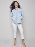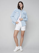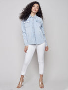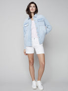 Un sublime morceau à superposer durant les mois plus chauds, vous pouvez porter ce manteau en denim pour femmes ouvert ou fermé. Il est facile de le porter de façon chic ou décontractée, et le denim bleu pâle délavé est un puissant neutre qui va avec tout. Et il y a les détails, évidemment!