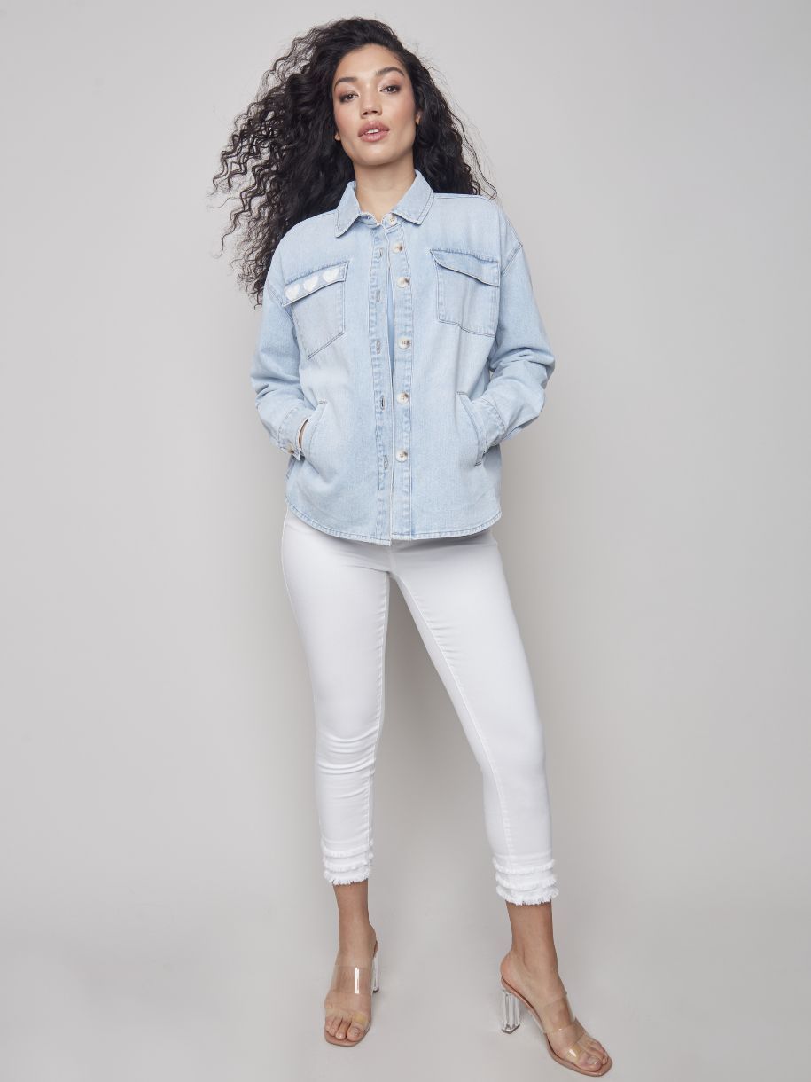 Dites-le avec un sourire – ou avec ce manteau en jean bleu délavé pour femmes arborant un écusson sourire au dos et des cœurs sur la poche avant. Vous adorerez la fermeture boutonnée à l’avant, la coupe ample, le col et les poches. Portez-le, mettez-le dans votre sac, chérissez-le – vous ne pouvez vous tromper avec celui-ci.