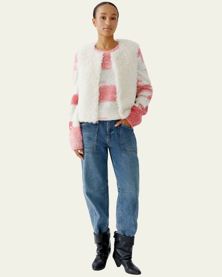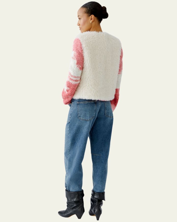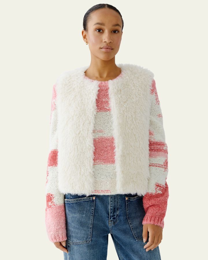 Cette veste sans manches se distingue par son design contrasté et tendance, parfait pour un look cosy et moderne. Sa coupe confortable et son mélange de matières en font une pièce idéale pour la mi-saison, à superposer sur un top ajusté ou un col roulé. Une veste unique qui conjugue originalité, confort et féminité avec audace.