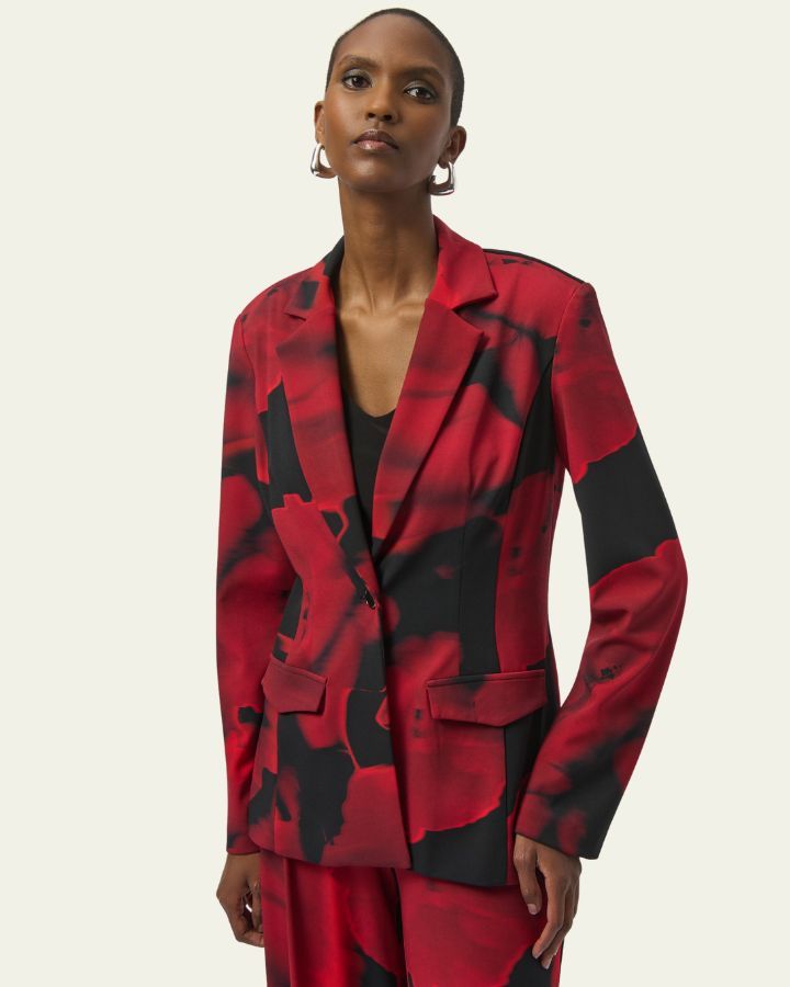 Ce blazer au motif abstrait rouge et noir est une pièce forte qui attire tous les regards. Sa coupe ajustée, son col à revers classique, et son fermoir à un bouton soulignent une silhouette élégante et contemporaine. Il est doté de deux poches à rabat à l'avant pour une touche pratique sans compromis sur le style. Parfait pour créer un look audacieux en journée comme en soirée, porté sur un haut uni ou une robe minimaliste.