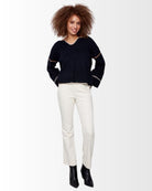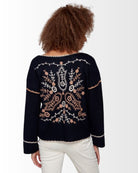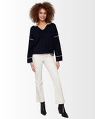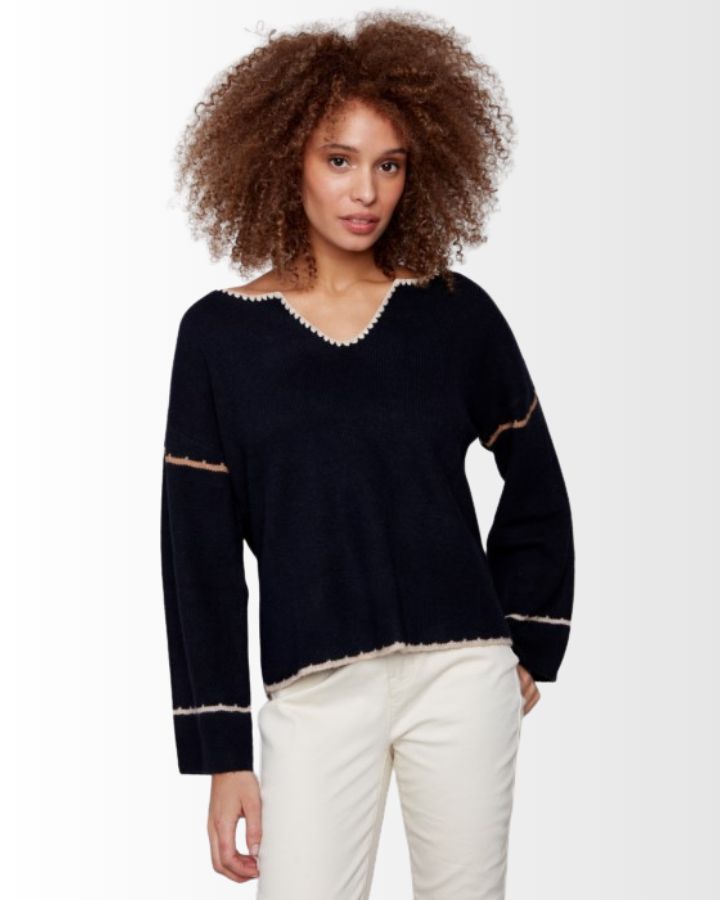 Ce pull bleu marine à col fendu séduit par ses finitions contrastées en blanc sur le col, les poignets et l’ourlet. Sa coupe à épaules tombantes et ses coutures décoratives sur les manches lui donnent une allure moderne et décontractée. Le dos du pull est sublimé par une broderie élégante, ajoutant une touche artistique inattendue. Parfait pour un look chic et confortable, à associer avec un pantalon clair pour un contraste stylé.