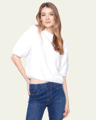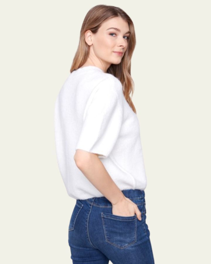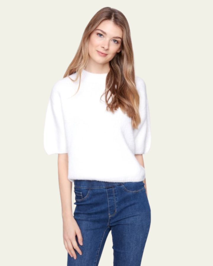 Ce pull éclatant séduit par sa texture moelleuse et chaleureuse, parfaite pour les journées fraîches. Les manches courtes bouffantes lui donnent une silhouette raffinée et féminine, tout en ajoutant du volume avec style. Son col rond légèrement montant renforce son allure classique et soignée. Facile à assortir, il se marie à merveille avec un jean comme avec une jupe fluide. Idéal pour un look cosy et chic, entre confort et tendance.