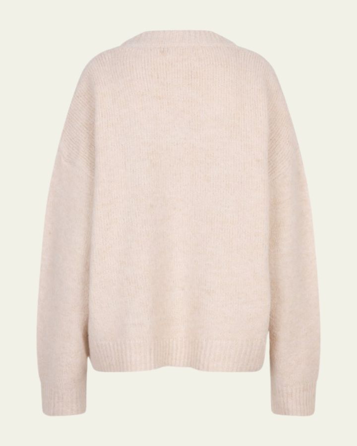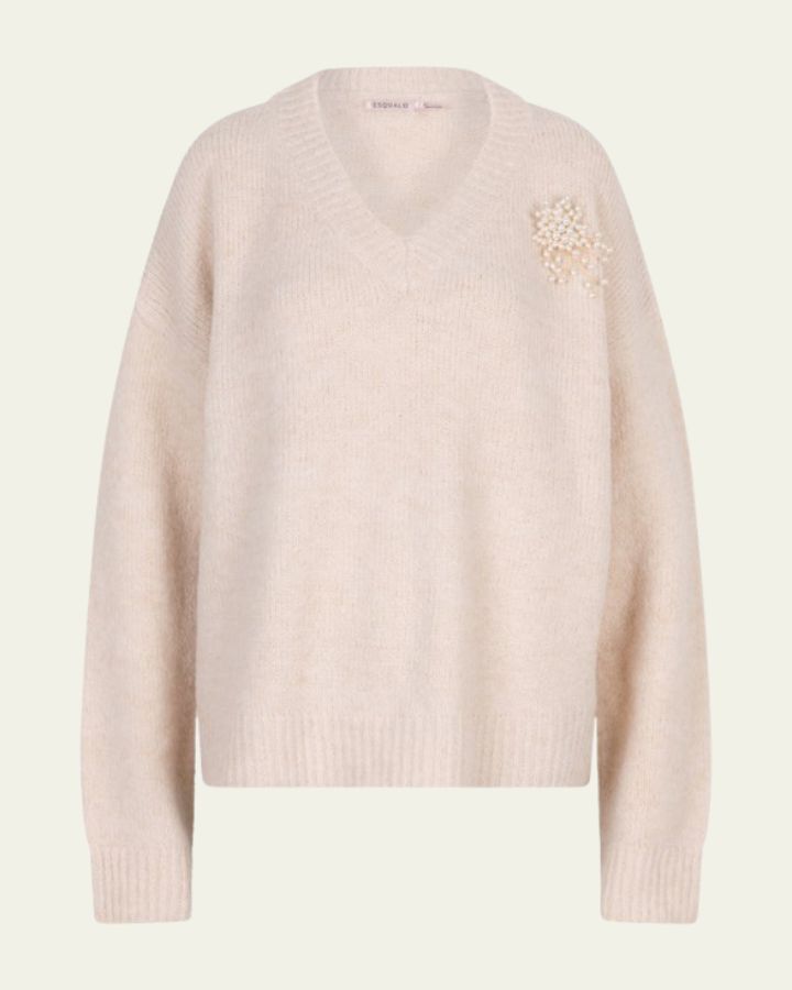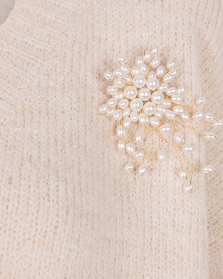 Ce pull offre une coupe ample et confortable, idéale pour une allure décontractée et élégante. Son tricot doux et moelleux procure une agréable sensation de chaleur, parfait pour les saisons plus fraîches. L'encolure en V ajoute une touche moderne tout en mettant en valeur le port de tête. Le détail raffiné : une broche en perles délicatement placée sur le côté gauche de la poitrine, apportant une note sophistiquée. Facile à associer, ce pull s’adapte aussi bien à un look casual avec un jean qu’à une tenue plus chic. Un incontournable du dressing qui conjugue douceur, élégance et polyvalence.