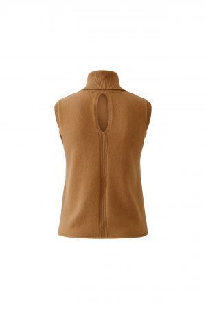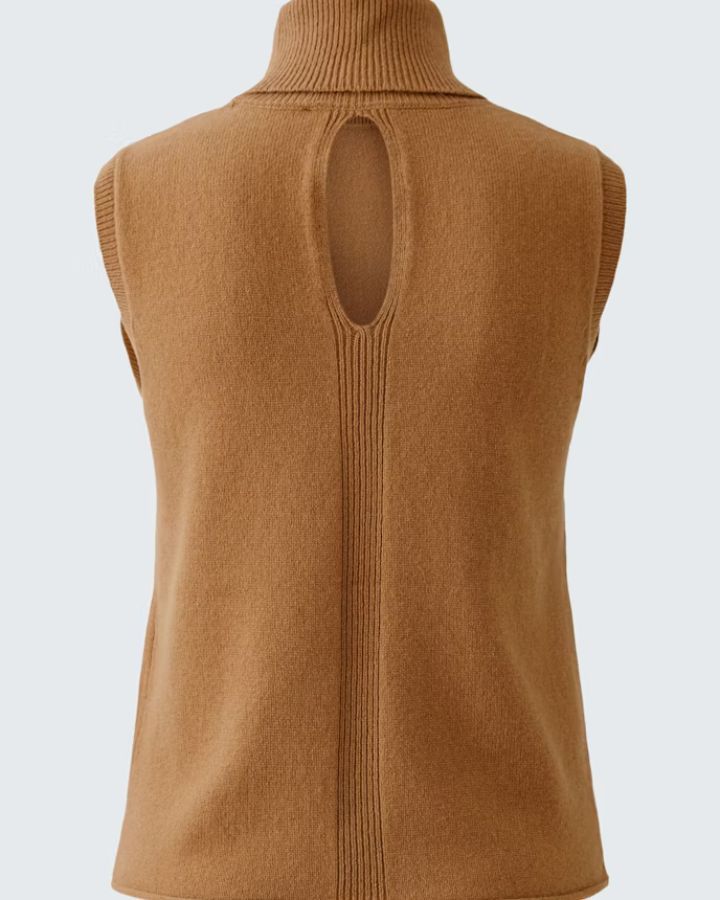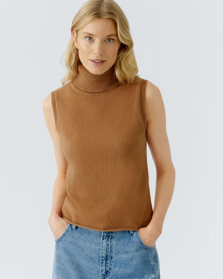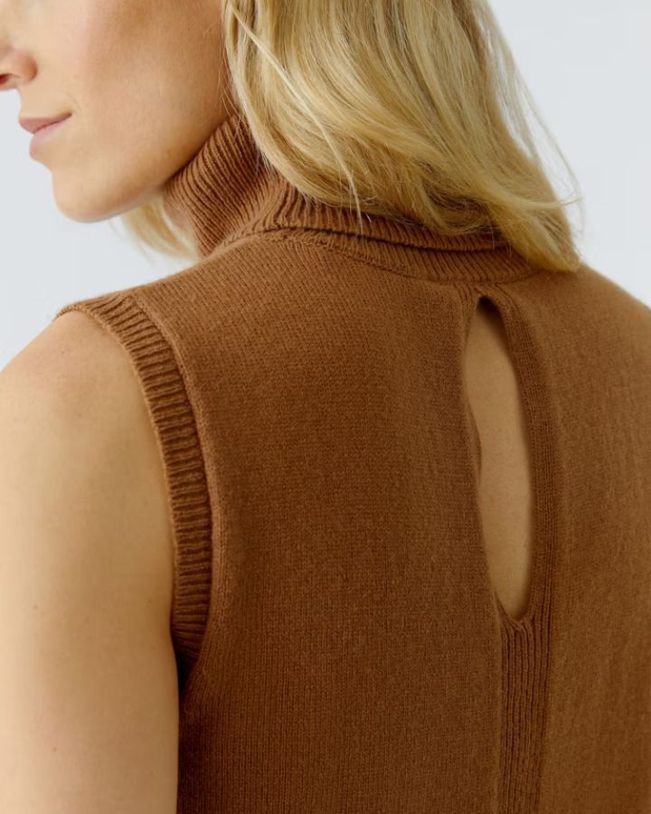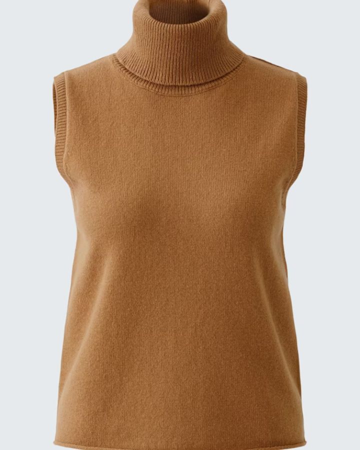 Ce haut sans manches incarne la sobriété élégante. Réalisé en maille épaisse et côtelée, il se distingue par son col roulé généreux et sa coupe légèrement évasée qui flatte la silhouette. La teinte chocolat profonde en fait une pièce chaleureuse, parfaite à superposer sur une chemise blanche ou à porter seule pour un look épuré. Un indispensable de mi-saison qui conjugue confort et raffinement.
