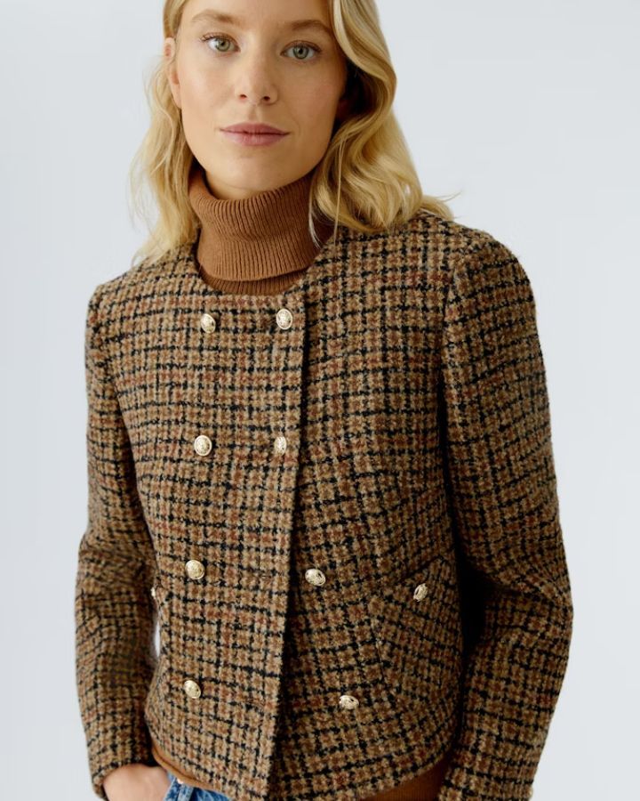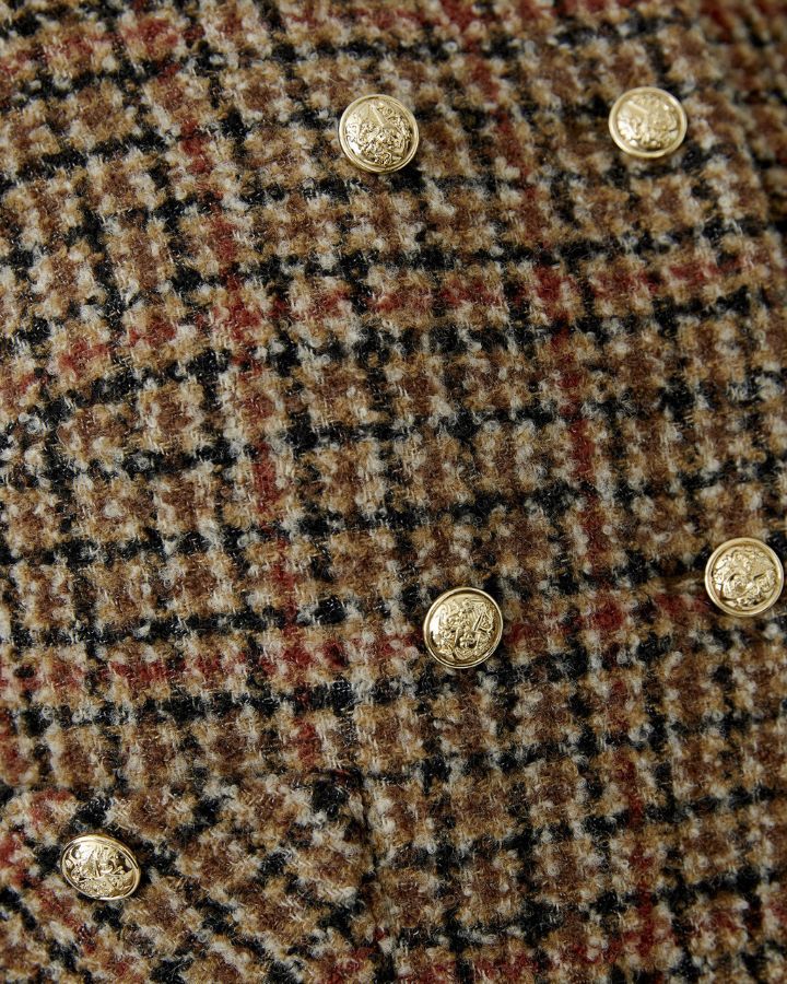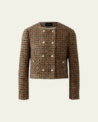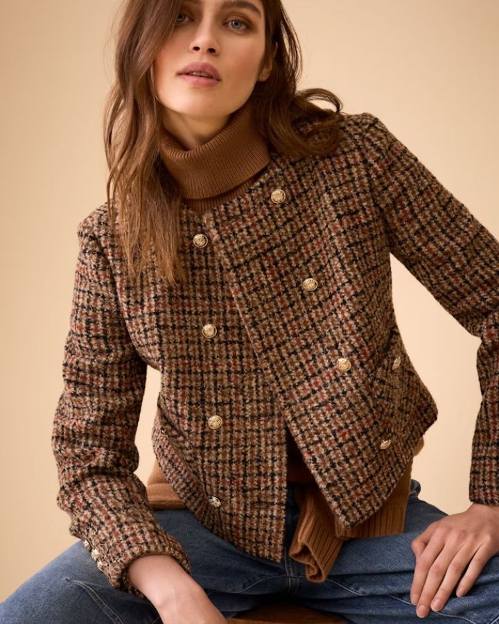 Ce jacket en tweed incarne l’élégance intemporelle. Confectionné dans une maille structurée à carreaux beige, marron et noir, il se distingue par son double boutonnage doré et sa coupe courte moderne. Les manches longues et le col rond apportent une touche classique, tandis que les détails dorés ajoutent du raffinement. À porter avec un jean taille haute pour un look décontracté chic ou avec une jupe crayon pour un style sophistiqué.