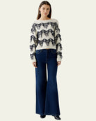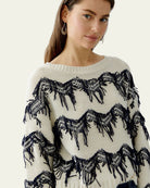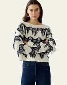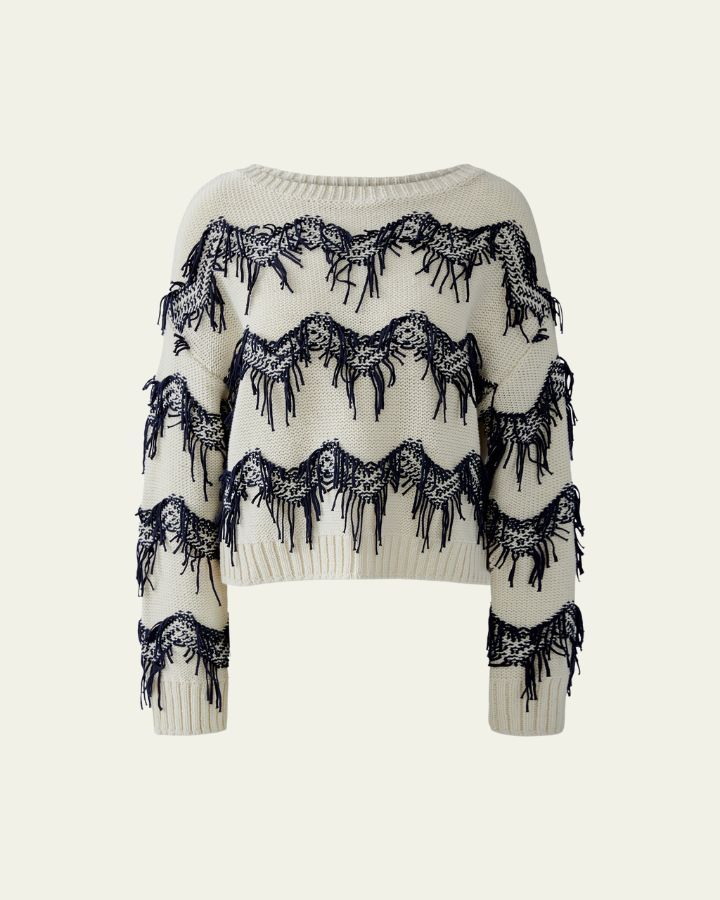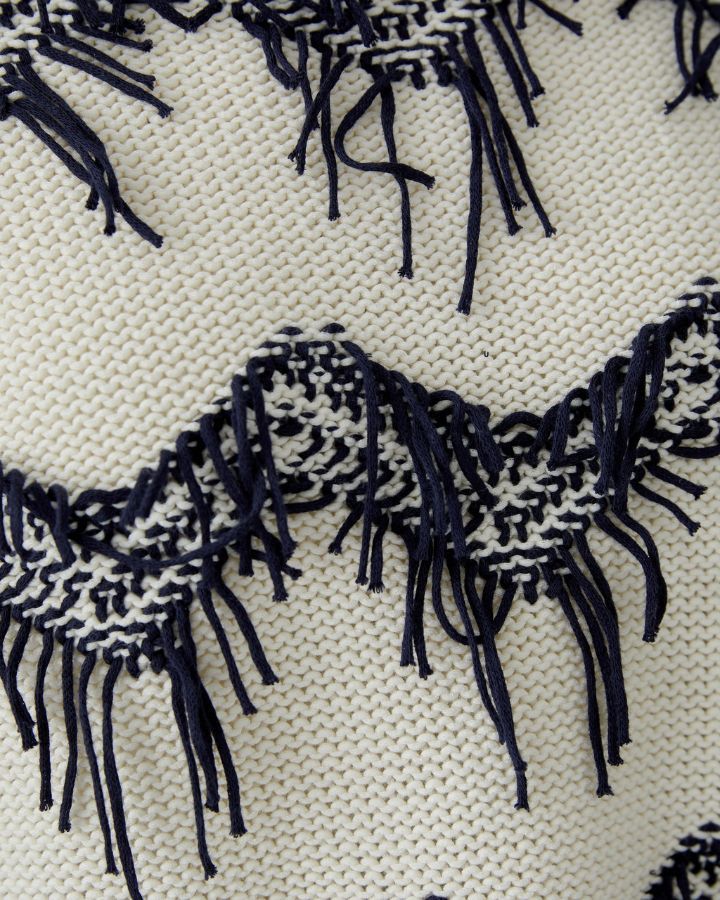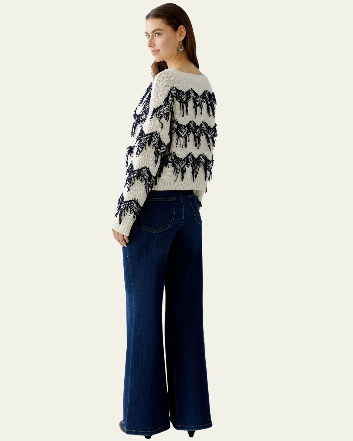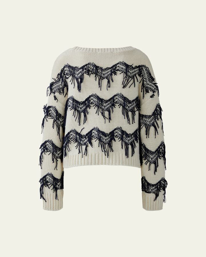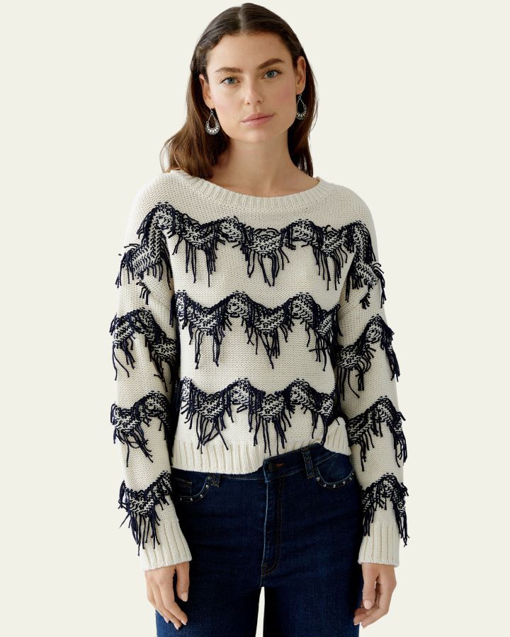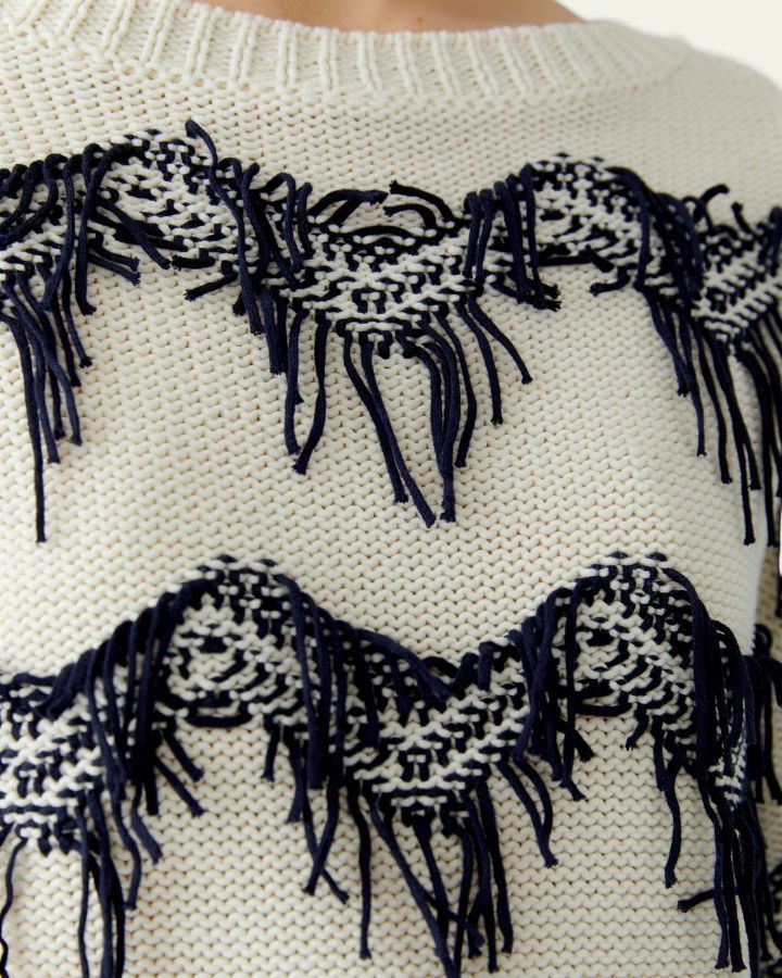 Ce pull blanc et bleu séduit par son design audacieux et texturé. Les franges bleues disposées en lignes horizontales apportent du relief et une touche artistique unique. Confectionné dans un tricot doux, il offre confort et style. Son encolure ronde et ses manches longues assurent une coupe classique. Parfait avec un jean ou un pantalon habillé, c’est une pièce forte qui allie originalité, modernité et confort.