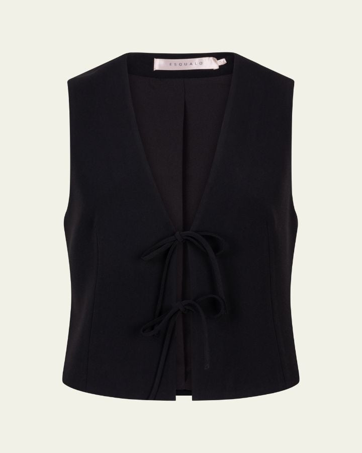 Ce gilet sans manches noir est une pièce élégante et moderne qui peut facilement compléter diverses tenues. Avec son encolure en V et sa fermeture par deux liens noués à l’avant, il apporte une touche raffinée et féminine. Ce modèle est idéal pour être porté avec un chemisier fluide pour un look chic ou avec un t-shirt simple pour une tenue plus décontractée.