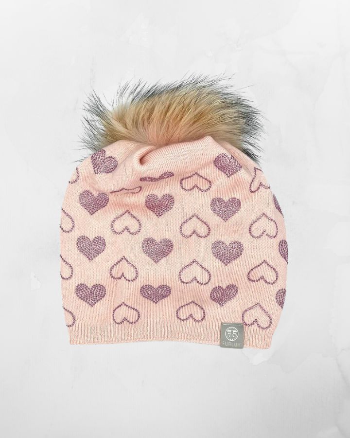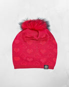 Belle tuque rouge avec de multiples coeurs, des brillances et un pompon de fourrure de renard.